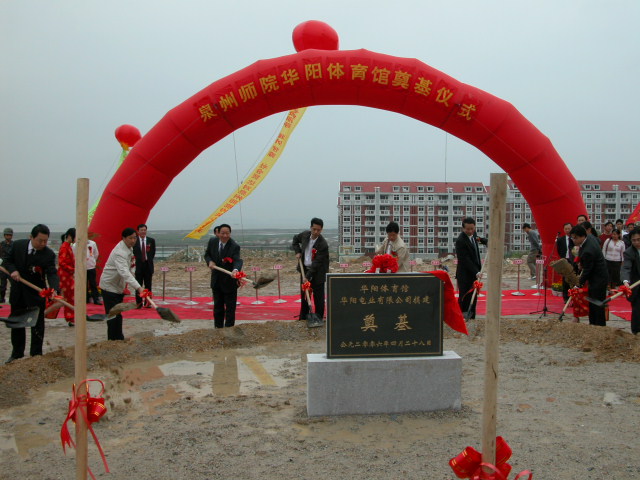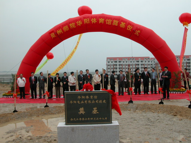 4月28日,我校华阳体育馆奠基仪式在东海校区隆重举行。泉州市委副书记、市长朱明,市政协主席林荣取,省台办副主任韦忠慈,市委副书记、市纪委书纪林文杰,市委常委、宣传部长宋长青,市委常委、军分区司今员邹卫国,市人大副主任、校党委书记洪辉煌,副市长黄维礼、潘燕燕、许昆贞,市政府秘书长李冀平,华阳体育馆捐资者代表、厦门华阳电业有限公司杨新明先生、陈骞先生以及校领导、市直相关部门负责人和师生代表500多人出席奠基仪式。