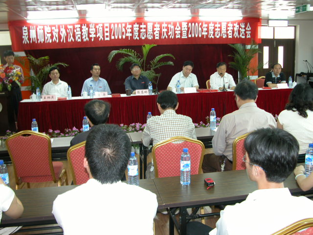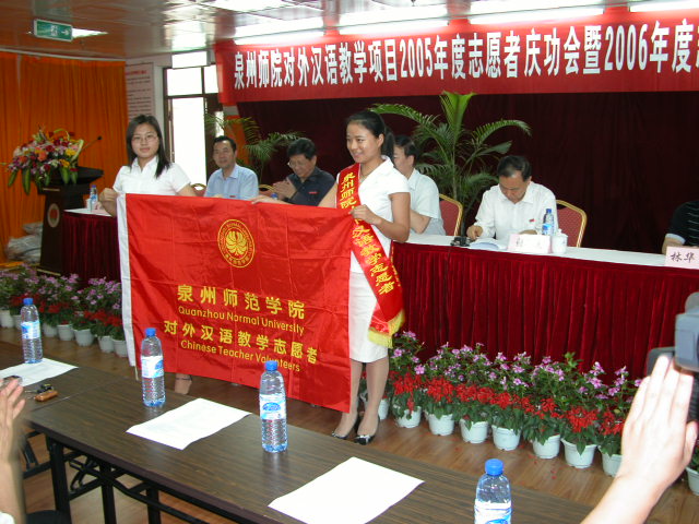 5月14日,我校第一批赴菲汉语教学志愿者汇报会暨第二批赴菲汉语教学志愿者欢送会在东海校区行政楼大会议室召开。省教育厅国际会合作交流处处长鲁同安、在家的校领导以及第一、二批赴菲汉语教学全体志愿者和师生代表近200人参加会议。校领导陈笃彬、赴菲支教志愿者代表、带队负责人在会上讲话。首批志愿者彭小知、王慧娟、陈川兰被国家汉办授予“优秀国际汉语教师中国志愿者”称号。会上,还举行泉州师院赴菲汉语教学志愿者队旗交接仪式。