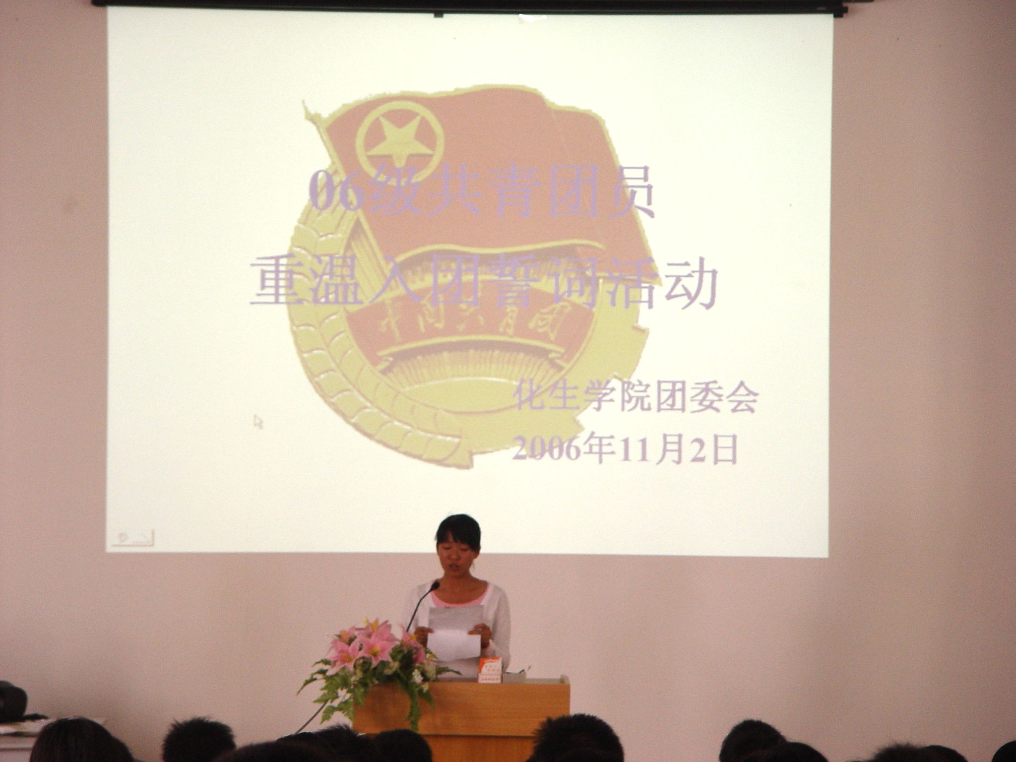 11月2日下午,化生学院06化学专业、生物专业新生在理工楼举行重温入团誓词暨建团活动。据悉,该活动系我校“增强共青团员意识教育活动”系列活动之一。
