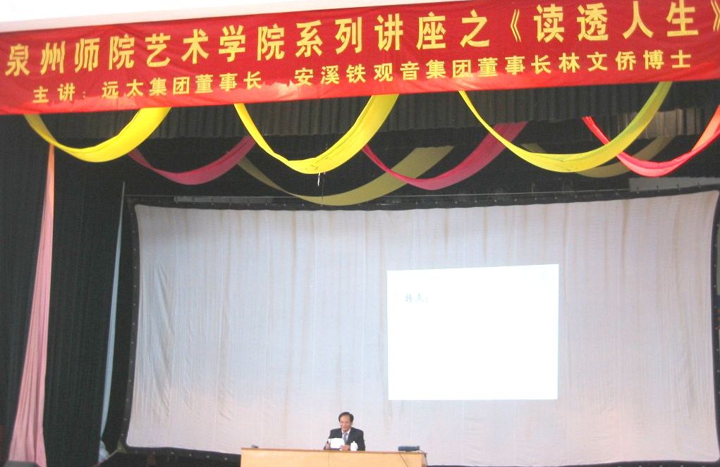 近日,远太集团董事长、福建安溪铁观音集团董事长、泉州师院艺术学院客座教授林文侨博士应邀为艺术学院的全体师生作题为《读透人生》的讲座。林文侨先生结合自己丰富的人生阅历、创办企业的历程和事业成功的经验,畅谈了种种不同的人生状况、对人生的深刻领悟及获得成功的诀窍。同时,他勉励艺术学院的学生们把握珍贵的大学时光,多加磨砺,把专业学习与今后的就业紧密结合,自觉地融入社会大舞台,为打造美好的人生奠定坚实的基础。