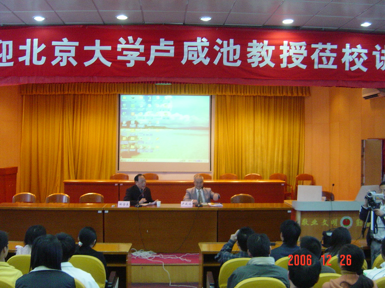 12月27日上午,应高职学院邀请,北京市政协常委、中国和平统一促进会常务理事、中华全国台湾同胞联谊会副会长、北京市台湾同胞联谊会会长、北京大学统战部部长卢咸池教授在崇福校区学术报告厅为该院学生作题为《台海局势综述》的学术讲座。副院长林华东参加了座谈会。他对卢教授拔冗莅校讲学表示欢迎和感谢,并向卢教授介绍我校近几年来的发展情况,就海峡西岸经济区建设和两岸交流问题同卢教授进行广泛深入的交流。