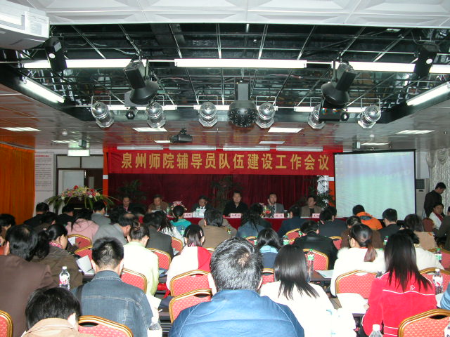 2007年元月4日,我校辅导员队伍建设工作会议在东海校区行政楼大会议室召开。校领导洪辉煌、陈笃彬、张舟、赖新民、王炳庆、林华东以及各二级学院党政负责人、机关各相关部门负责人和全校辅导员参加了会议。校党委书记洪辉煌和陈笃彬院长在会上作重要讲话。校党委副书记赖新民在会上传达全省高校辅导员建设工作大会精神,王炳庆副院长在会上作《泉州师院学生政治辅导员工作实施细则》的说明,林华东宣读2005-2006学年度省、市、校级“优秀思政工作者”和校级“优秀辅导员”表彰决定,会议由党委副书记张舟主持。