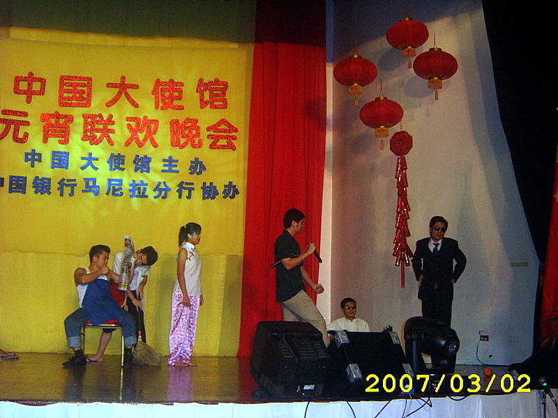 晚会上,我校志愿者章贵全、黄丽瑜等人表演了自编自导的哑剧——《理发》,深受到大家的喜爱。李进军大使和各位参赞均出席了晚会。参加晚会的还有:部分中资机构员工、留学生代表和菲律宾马尼拉部分侨校的师生。(林国宏)