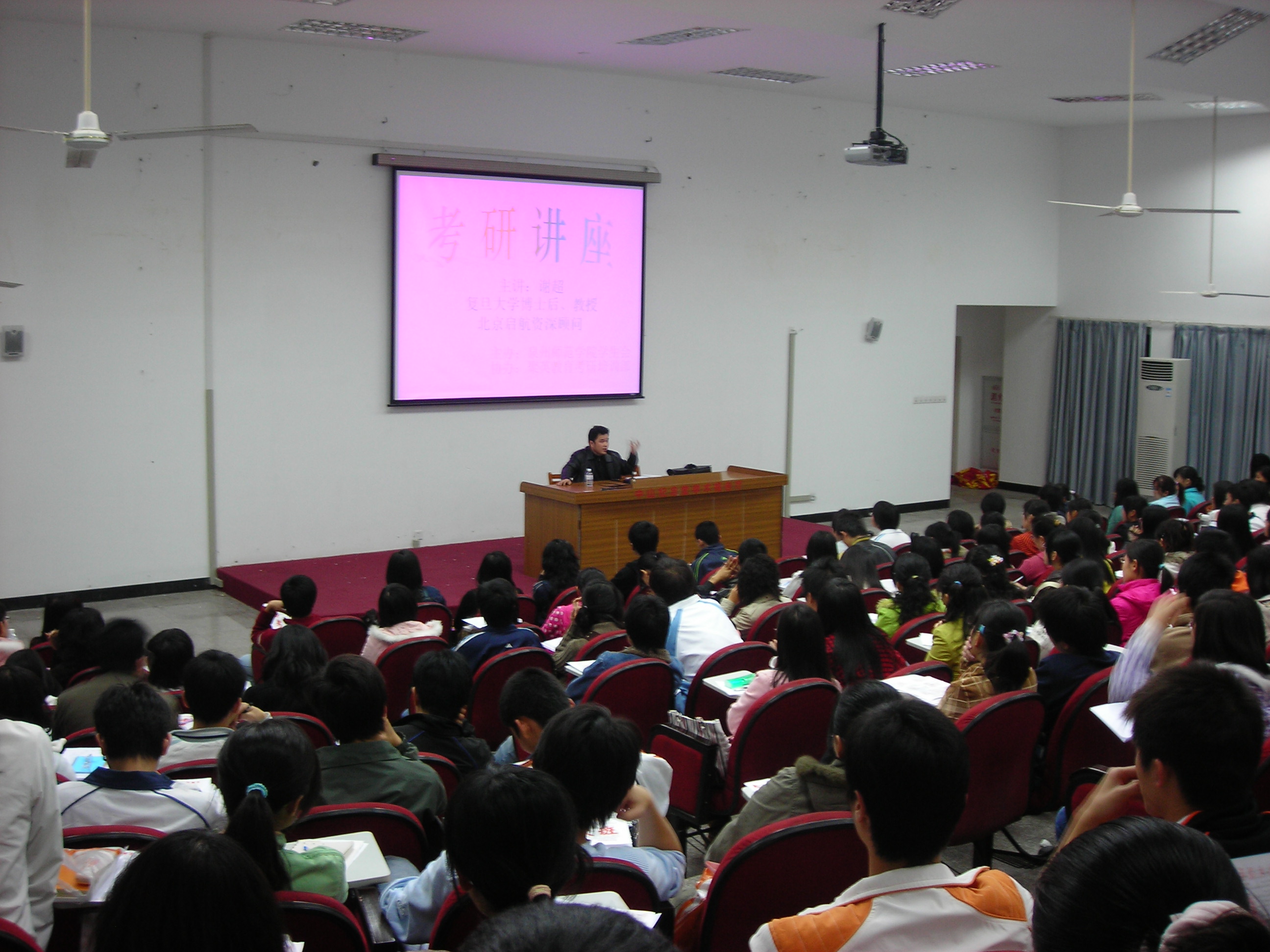 中山纪念堂内座无虚席,气氛热烈。谢教授主要从考研的基本问题,今年研究生招生指导思想,考研学生面临的困惑,学校、专业、导师的选择等问题作了详细深入的分析,重点指导同学们政治科目的复习应考。同时,他还指出,如今考研已从重知识向重专业转变,这是一个不可逆转的趋势,并结合自身经历,鼓励同学们要对自己有信心,考研其实并不难,人人都有机会。深入浅出的讲座得到了广大同学的一致好评。(校团委)