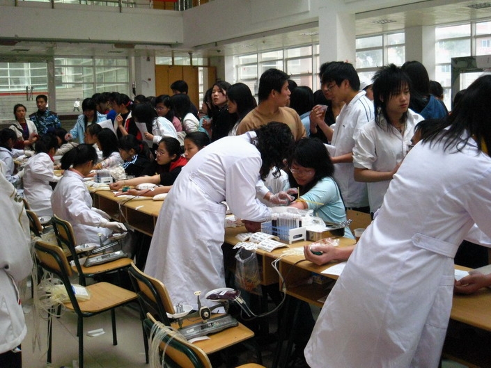 外国语学院青年志愿者协会除了在现场热情为前来献血的同学们做好各项服务,还协助医生做好参与献血同学的护理工作。(外国语学院)