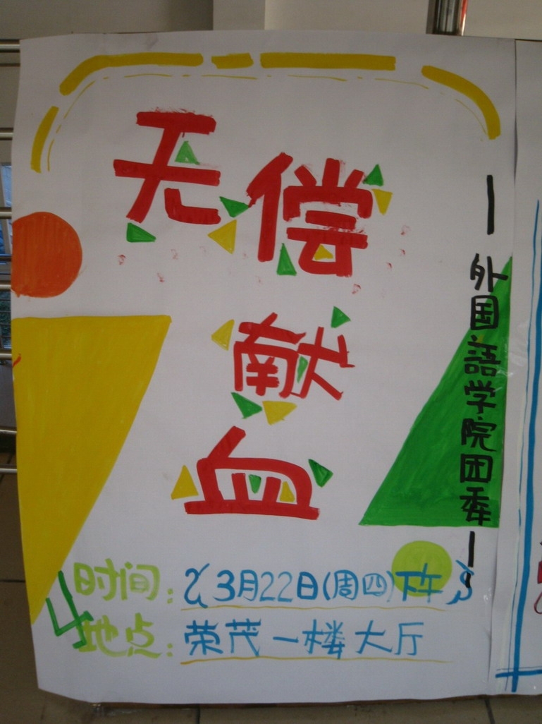 3月22日下午,我校与市中心血站在荣茂一楼大厅开展“无偿献血”活动。外国语学院和人文学院的一百多名新老生参加了此次活动。