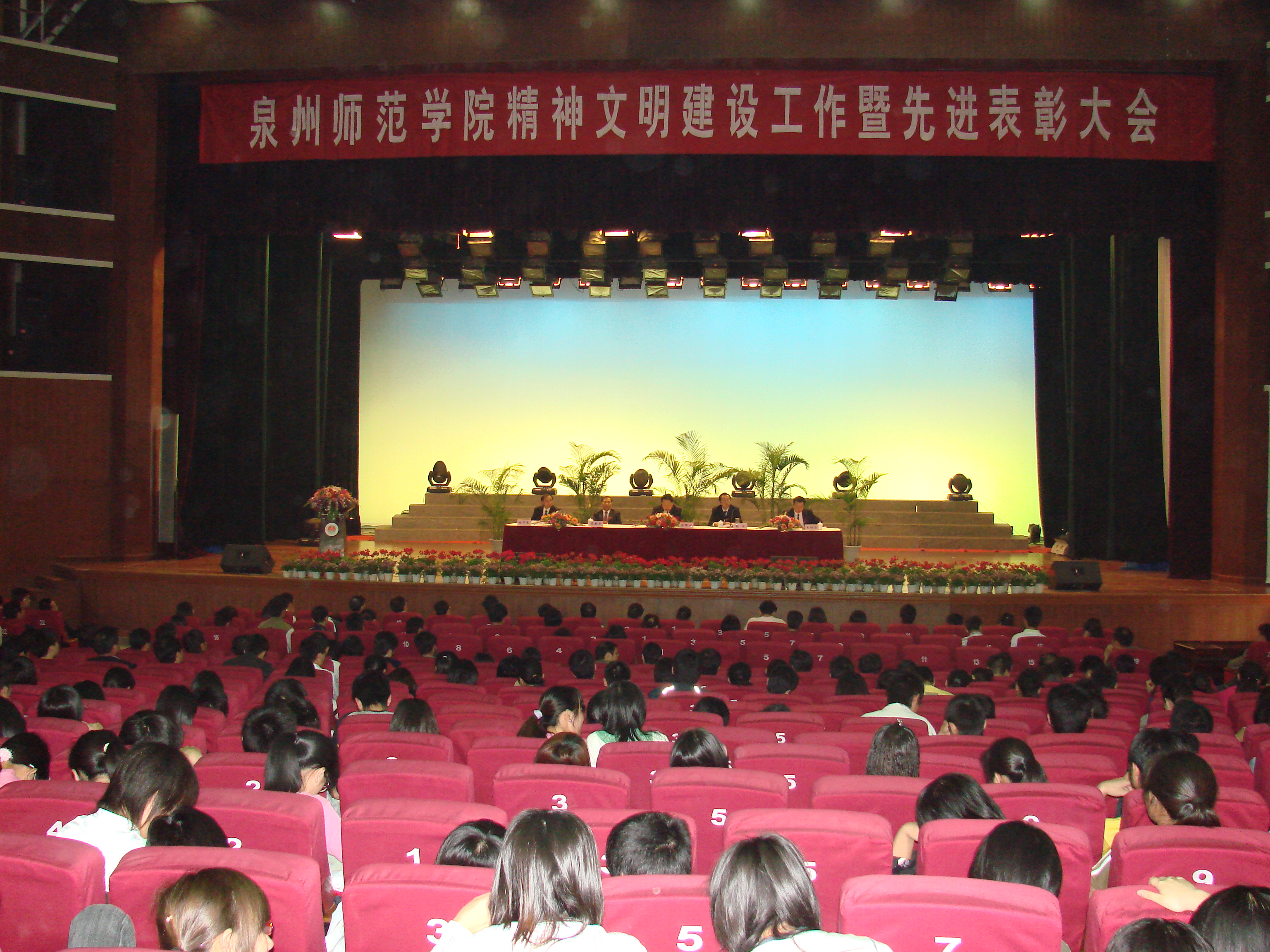 4月26日,我校精神文明建设工作暨先进表彰大会在东海校区陈祖昌大礼堂召开。校领导洪辉煌、张舟、赖新民、王炳庆、林华东以及副科级以上干部、机关全体干部、全校辅导员、获奖单位和个人代表,共1000多人参加会议。校党委书记洪辉煌作题为《建设社会主义核心价值体系,构建文明和谐校园》重要讲话,副书记张舟作题为《围绕学校发展和人才培养目标,努力构建文明和谐校园》的工作报告。大会表彰了精神文明建设工作先进集体和先进个人。大会由王炳庆副院长主持。