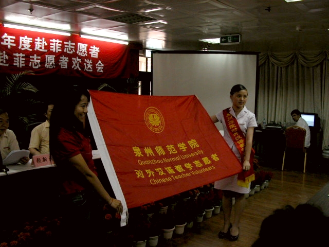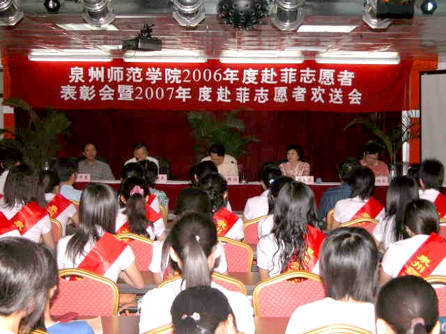 5月22日,我校2006年度赴菲志愿者表彰暨2007年赴菲志愿者欢送会在东海校区行政楼大会议室召开。泉州市人大常委会副主任、校党委书记洪辉煌,泉州市人民政府副市长潘燕燕,校领导赖新民、王炳庆、林华东以及机关相关部门负责人和2006年度、2007年度全体赴菲汉语教学志愿者、师生代表共200多人参加会议。会议表彰了获得“优秀国际汉语教师中国志愿者”称号的白培琴、黄丽瑜、林桂贤、林一娟、余翮、郑建云等六位同学和获得“泉州师院汉语国际推广志愿者项目先进单位”的校办、外事办等15个单位。洪辉煌和潘燕燕在会上作了讲话。会议由党委副书记赖新民主持。
