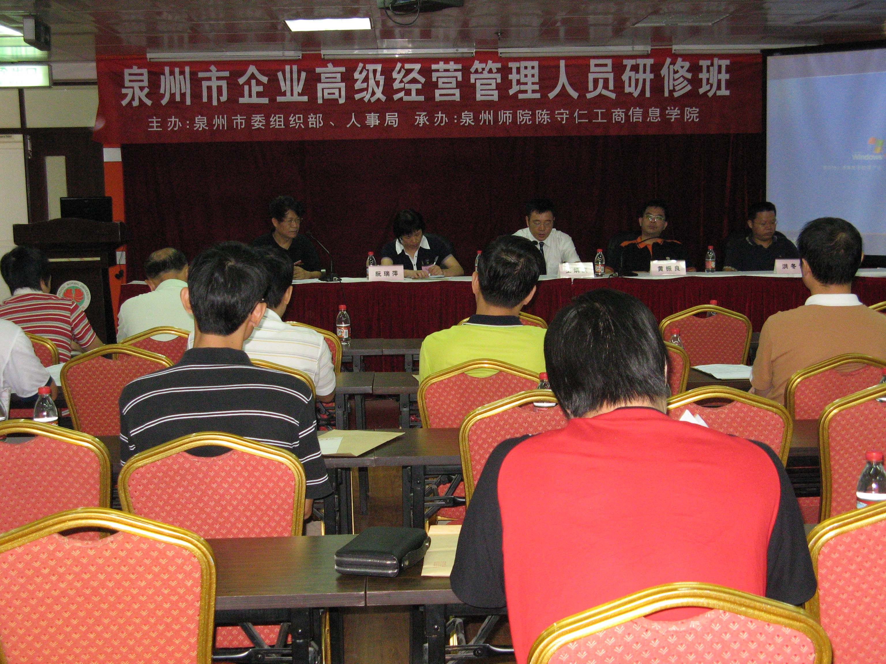 9月7日,由泉州市委组织部、泉州市人事局主办,泉州师院陈守仁工商信息学院承办的“泉州市企业高级经营管理人员研修班”在我校行政楼二楼会议室开班。副院长王炳庆、市人事局黄振良副局长在会上致辞。参加此次研修的有来自市属国有企业的董事长或总经理,如国有资产投资公司、自来水公司、公交公司等,也有来自规模以上非公有制企业的董事长或总经理,如福马食品集团、宏发集团、闽发铝业等。