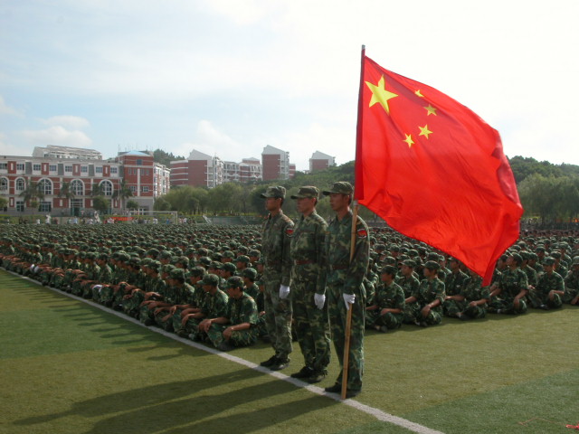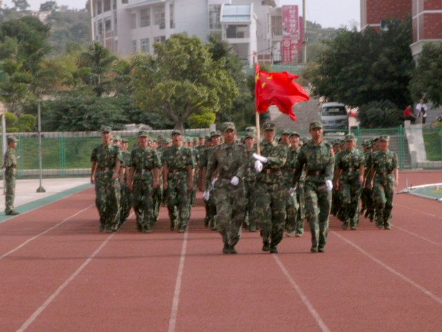 在军训会操仪式中,2007级新生在阅兵式完毕后进行了分列式和军体拳表演,他们的精彩表演赢得阵阵掌声。新生代表和解放军73311部队军训团政委分别上台讲话。