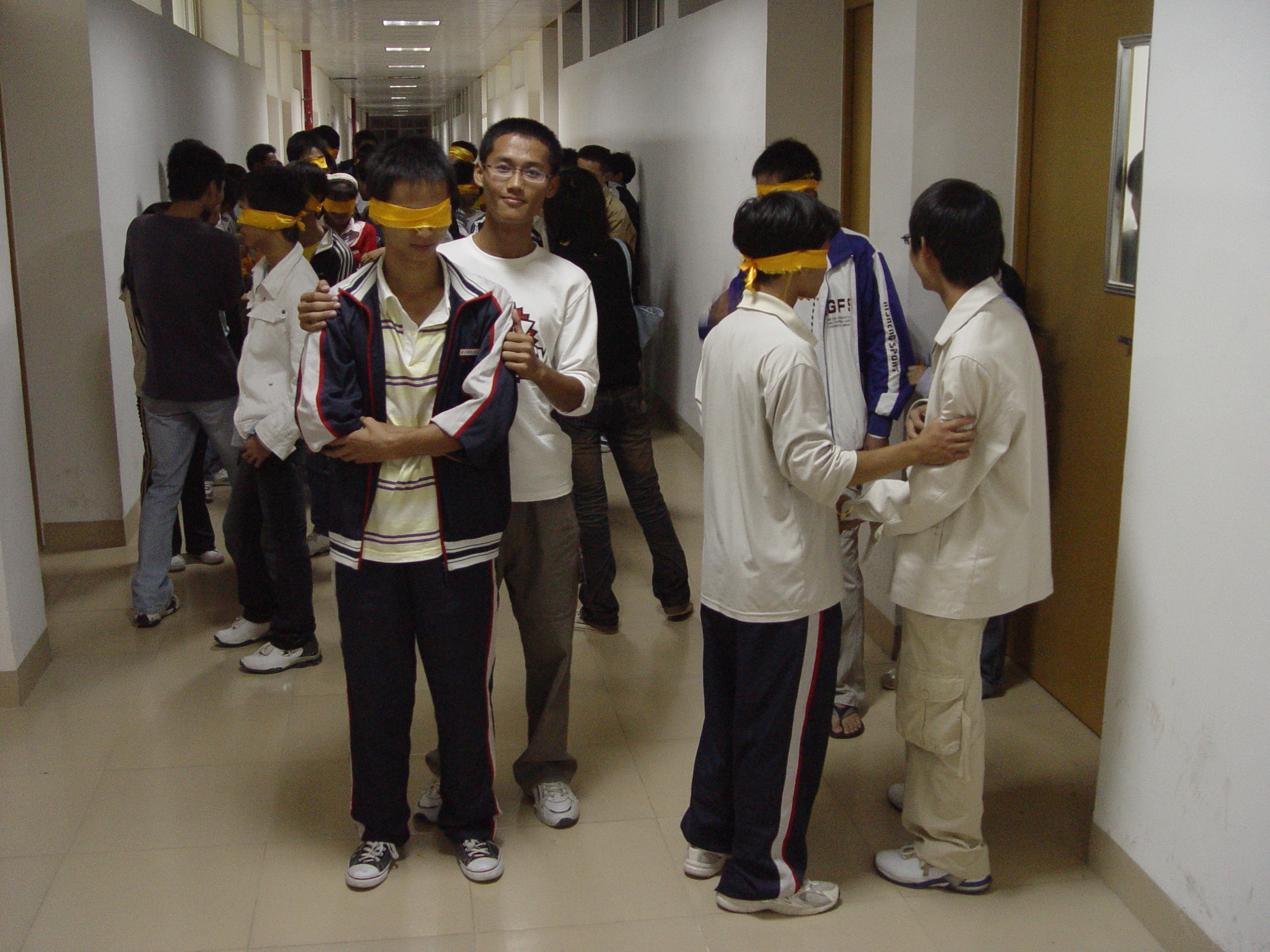 活动中,策划组精心设计了几个游戏:抓手活动、个性名片、坐地起身、诺亚方舟、圆球游戏、瞎子走路(导盲)、叠罗汉、一指顶人等,特别是诺亚方舟游戏,把活动推向了高潮。最后的导盲游戏更是让同学体会到信任与被信任、自助和他助的快乐。