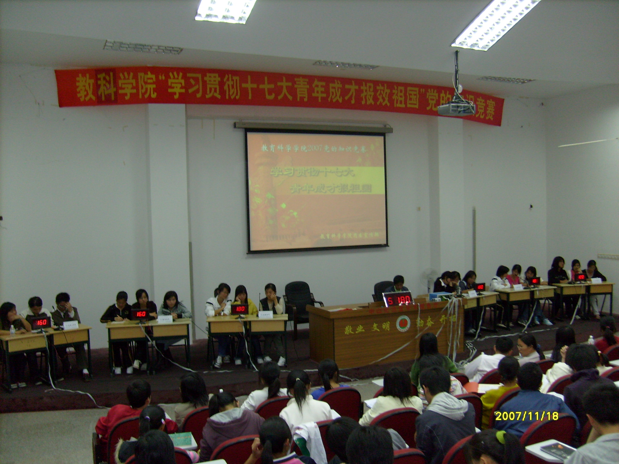 教育科学学院举办的“学习贯彻十七大 青年成才报效祖国”党的知识竞赛决赛在孙中山纪念堂五楼进行。比赛分为初赛和决赛两阶段,题目有必答、快速判断、抢答、观众娱乐互动及冒险题五种类型。经过两个半小时的激烈角逐,教育技术专业06代表团以280分赢得冠军。与观众的娱乐互动环节是本次比赛的一大亮点,把活动推向了高潮。(工商信息学院、教育科学学院)