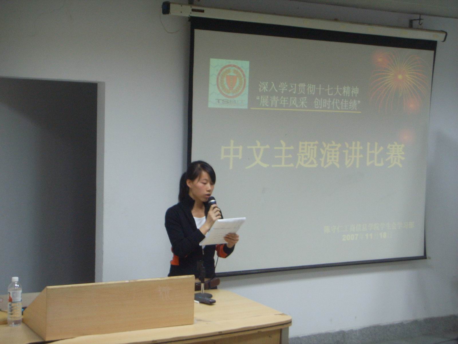 工商信息学院在文科楼B栋213室举办了一场以“展青年风采 创时代佳绩”为主题的演讲比赛。32位同学上台参加了比赛。比赛的主题围绕“总结党一路走来的光辉历程,描绘党为人民的利益奋不顾身的伟大精神,歌颂了十七大胜利召开的伟大历史意义”而展开。通过比赛,使同学们认识到中国共产党带领人民群众一路走来的艰辛与当代繁荣发展的来之不易,为同学们树立共建和谐社会的坚定信念,也为增进同学间的友谊提供一个良好的平台。