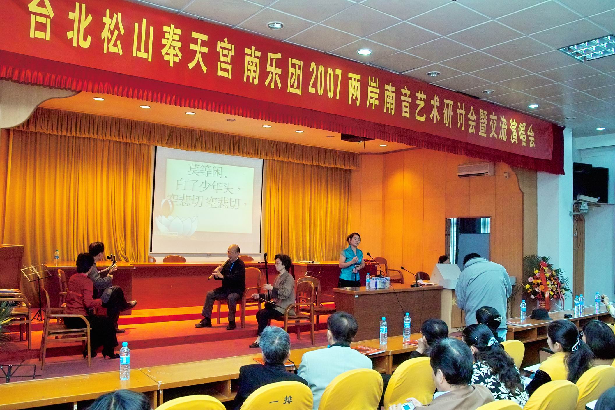 来自海峡彼岸的台北松山奉天宫南乐团是闻名海内外的民间艺术团体。该团以弘扬南管音乐为己任,多次与大陆专家学者、弦友进行南音交流。活动中,台北松山奉天宫南乐团的专家、弦友举行《唐诗宋词南管唱——集萃大观》推介演唱会,他们运用典雅古朴的南音曲调唱腔,力求将文学与音乐完美地结合,努力把南音艺术推向另一个高度。南音系的学生也表演了精彩的南音演唱演奏节目。随后,双方还进行了学术交流。