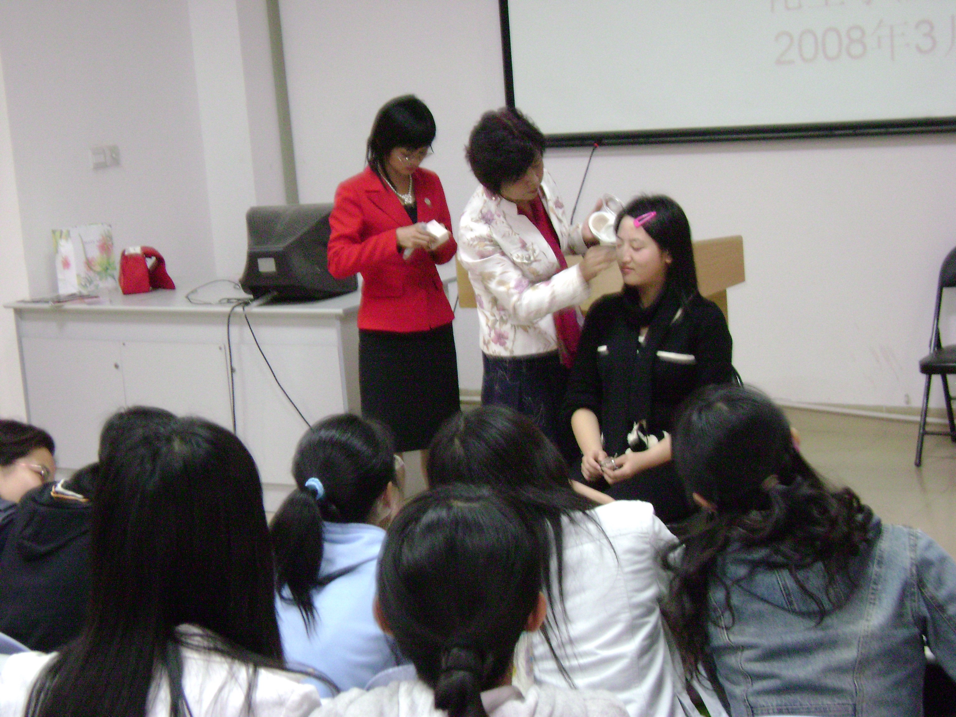 讲座中,郑莉与同学们积极互动,认真分析了当今大学女生几种比较常见的皮肤问题,并分别介绍了各自的保养方法。同时,她还邀请了女生上台,现场做起了护肤示范,该女生在一番精心装扮后更显得美丽迷人。现场气氛一直轻松活跃。郑莉声情并茂、幽默风趣的演说赢得了在座同学的阵阵掌声。