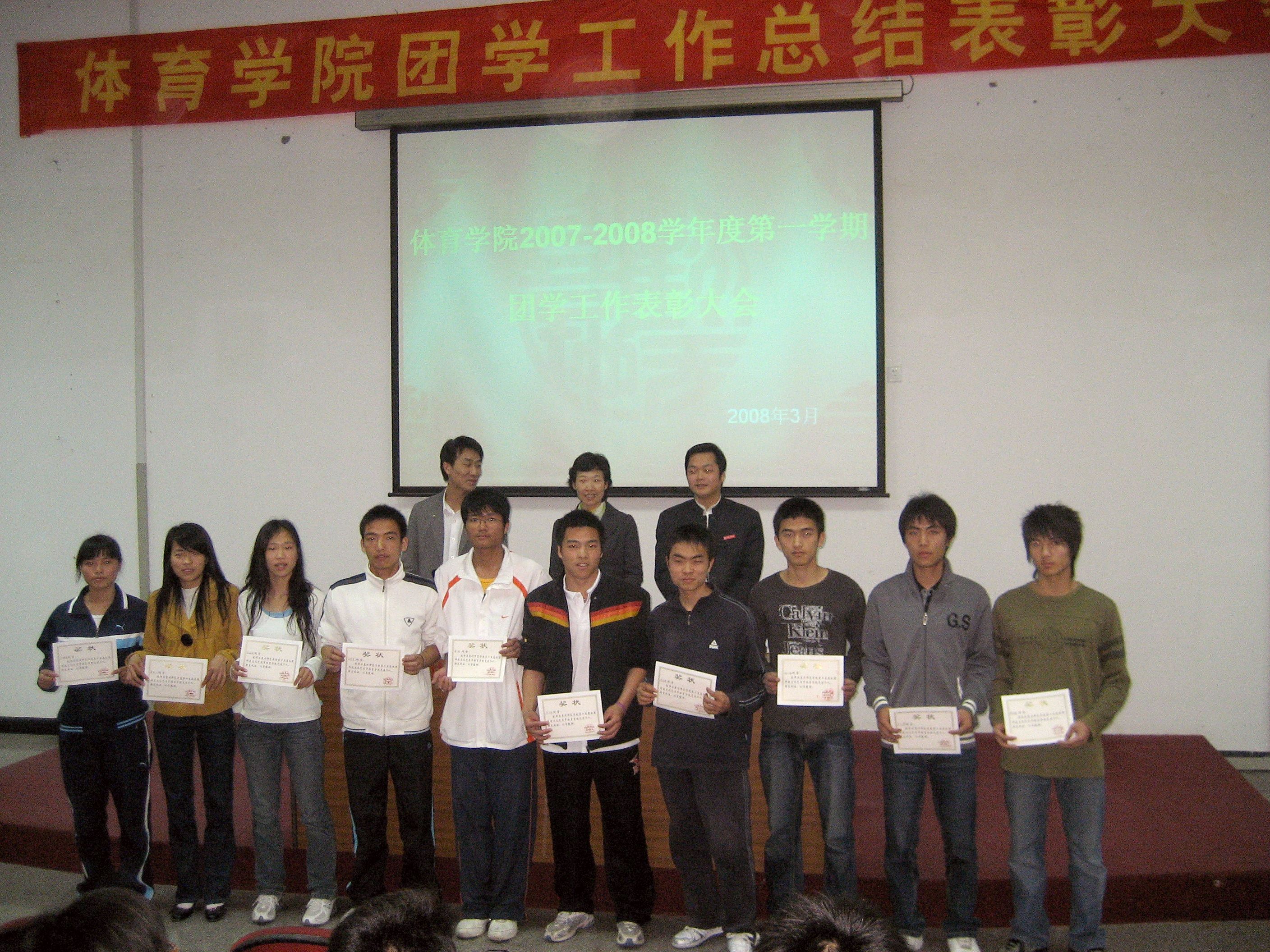 3月13日下午,体育学院在孙中山纪念堂一楼学术报告厅召开2007—2008学年度第一学期团学工作总结表彰大会。体育学院党总支负责人,团委会、学生科负责人,辅导员以及全体学生出席了会议。