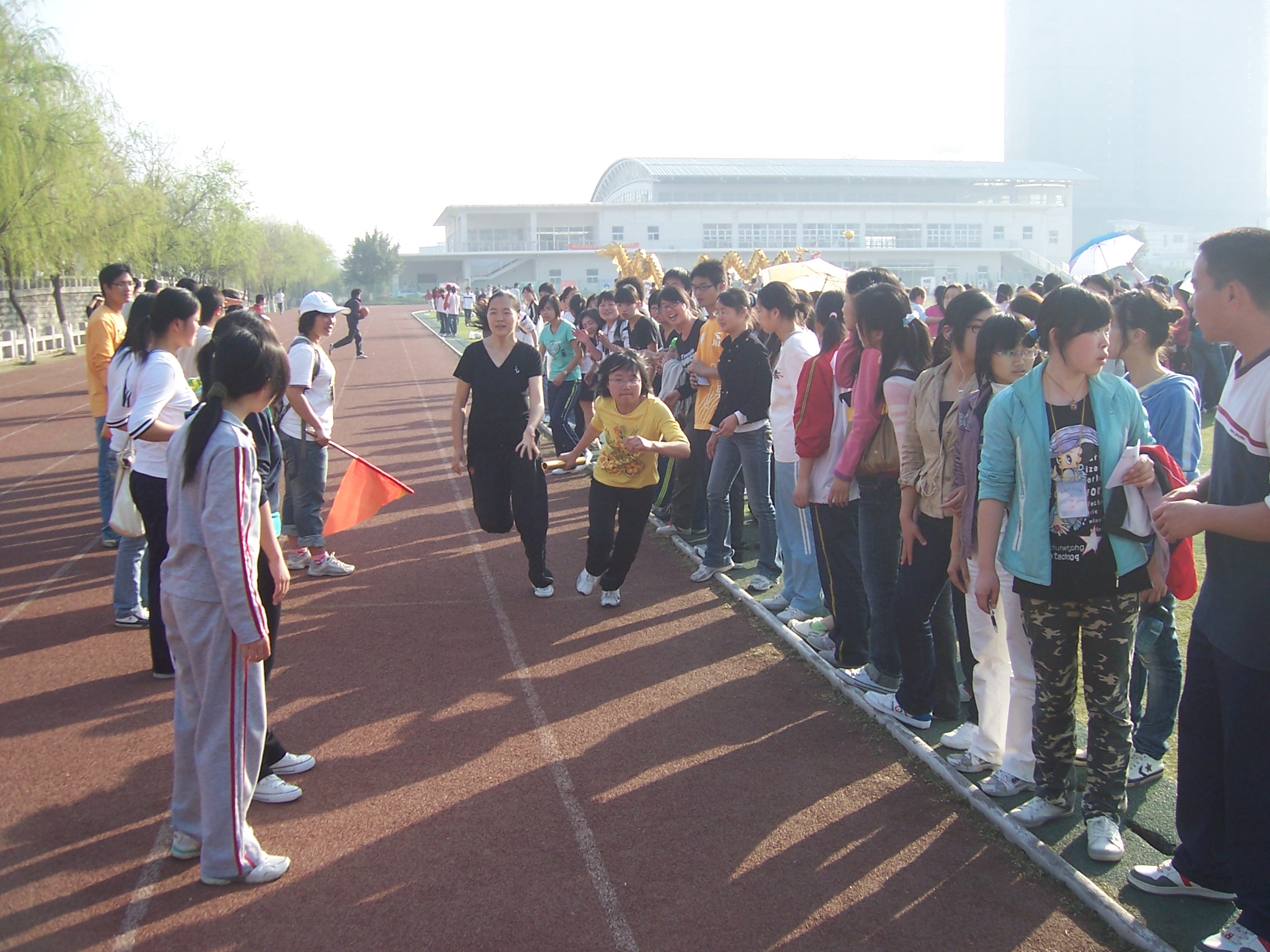 万米接力赛由各班级选出20名女同学为一组参加比赛,选手需先后在跑道上进行200米、100米接力,最后总路程应达到一万米。这是一项既考验耐力,又讲究团结协作的比赛。赛道上,选手们尽力拼搏,有的同学跌倒了,但还是爬起来继续比赛,有的同学虽落后了,但还是坚持不懈跑完全程。现场的气氛十分热烈,欢呼声、呐喊声传到赛场的每个角落。