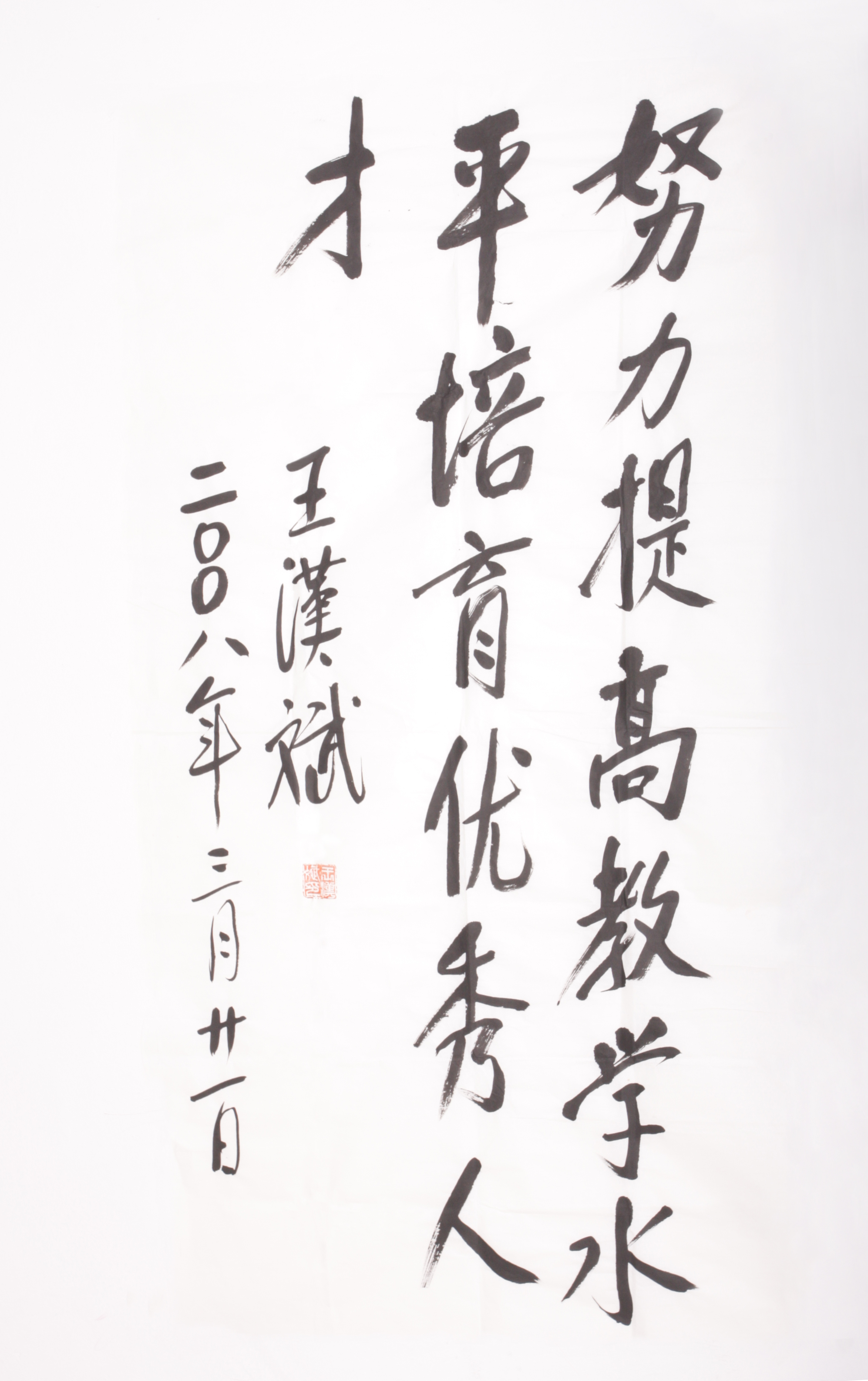 王汉斌同志为我校50周年校庆题辞:努力提高教学水平,培育优秀人才。