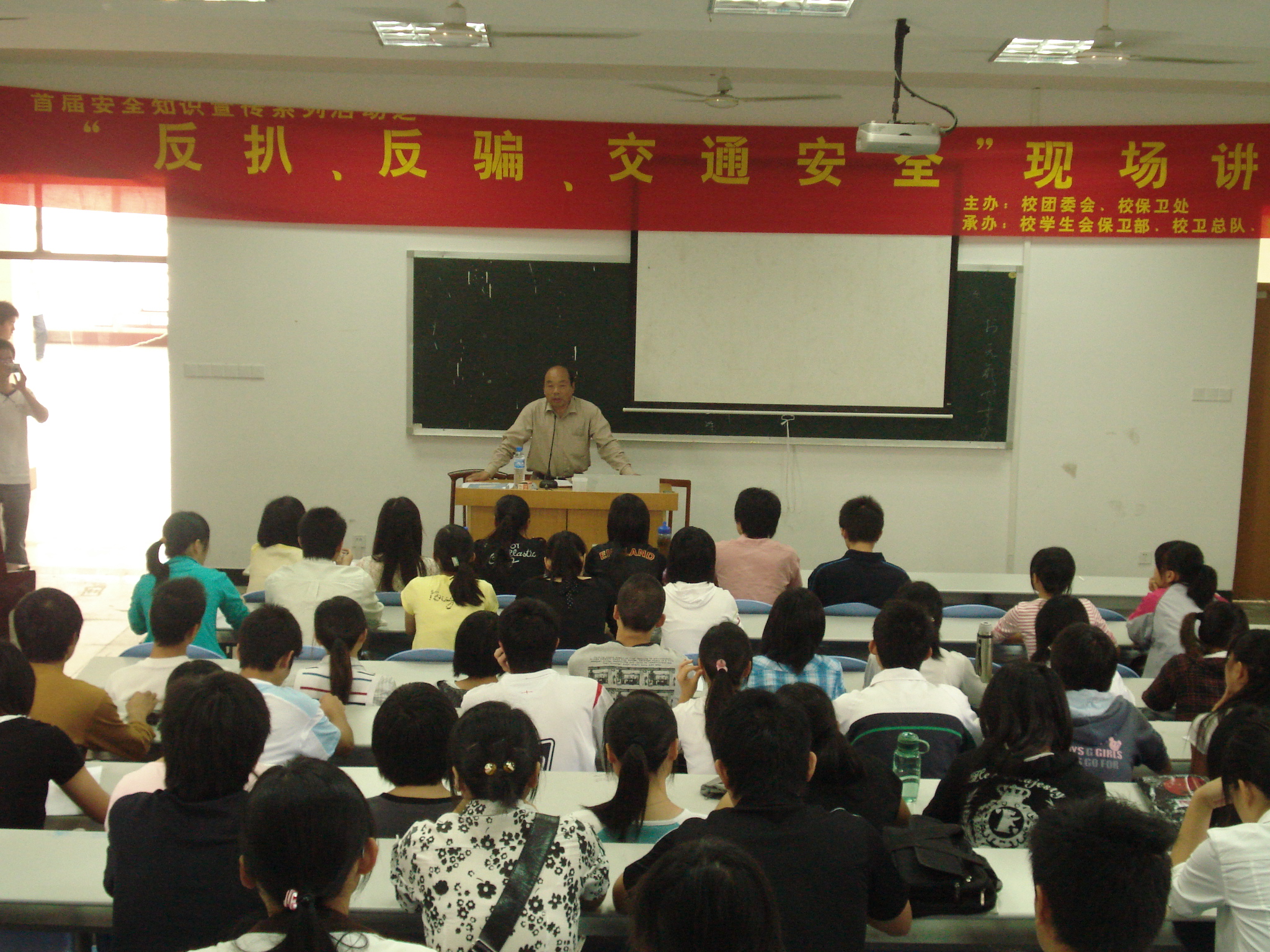讲座以“反扒、反骗、交通安全”为主题,邀请了校保卫处朱老师到场为广大同学讲解安全预防知识。朱老师就学生个人人身安全、非法传销组织活动、手机短信诈骗、校园内防盗和校外反扒等方面的知识并结合身边的一些案例为现场听众做了详细的讲解。在讲解过程中,他还向在场同学提了一些关于安全方面的方法和建议,希望我校学生能够提高安全防范意识,切实保护自己的人身及财产安全。