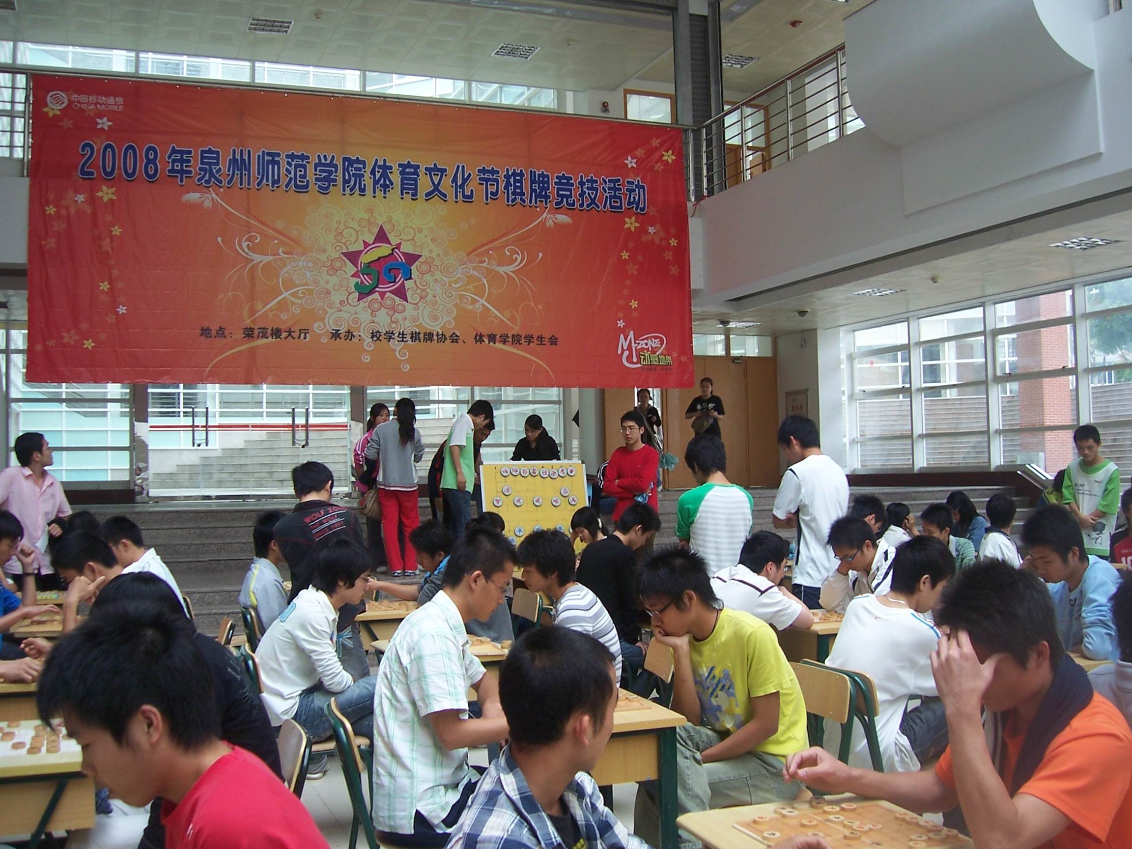 2008年5月5日下午,2008年体育文化节学生棋牌竞技活动在荣茂楼大厅举办,活动设有象棋、五子棋、跳棋三项目,活动采取团体比赛形式,共有来自十个学院代表队参加活动,本次活动由文化节组委会主办,校棋牌协会、体育学院学生会共同承办。