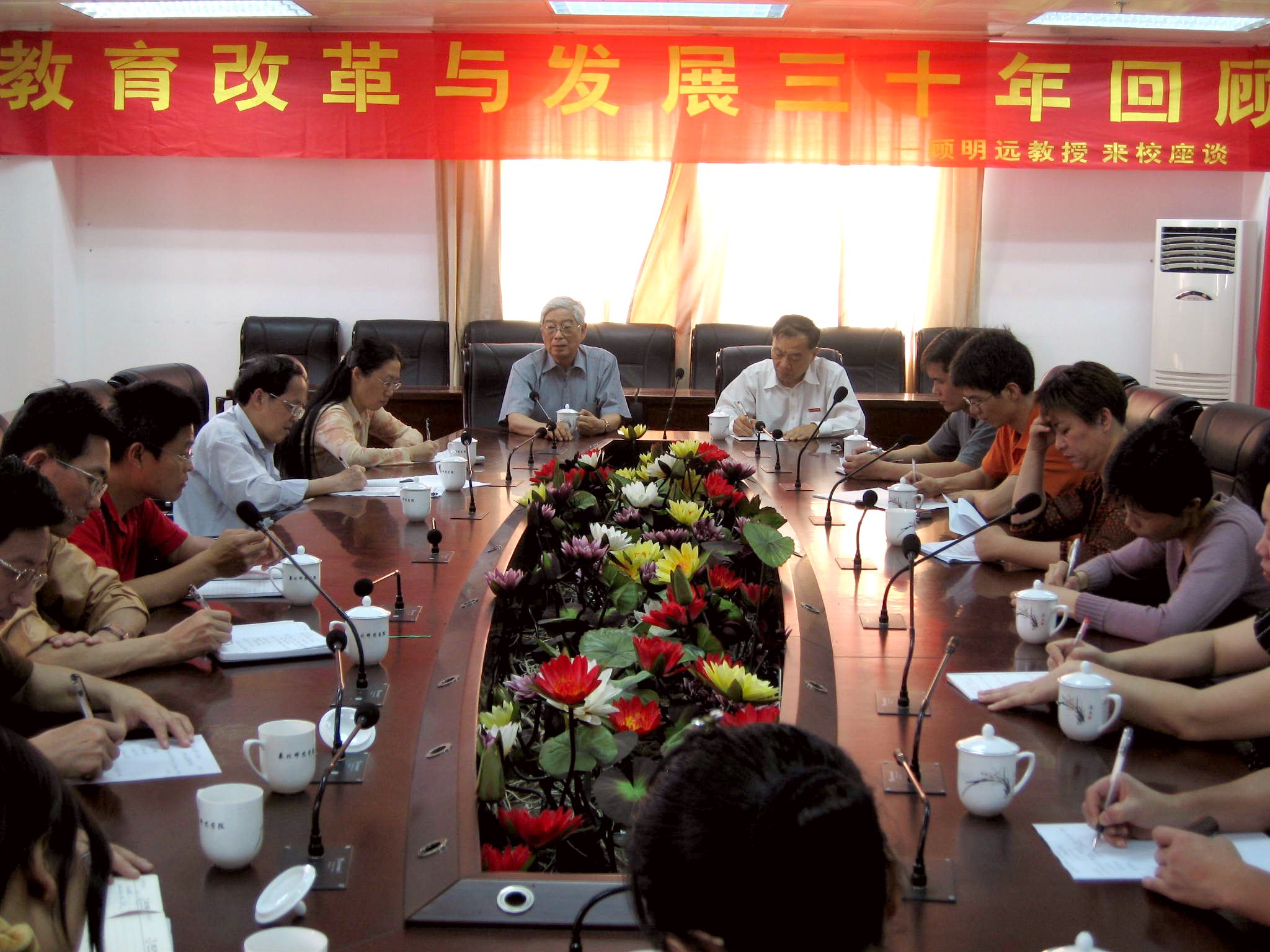 2008年5月16日下午,国务院学位委员会教育学评议组召集人、教育硕士专业学位教育指导委员会主任、中国教育学会会长、北京师范大学教育管理学院院长顾明远教授莅临我校座谈。座谈会由校党委副书记赖新民主持,教务处、教育科学学学院、化生学院的教师代表参加了座谈。