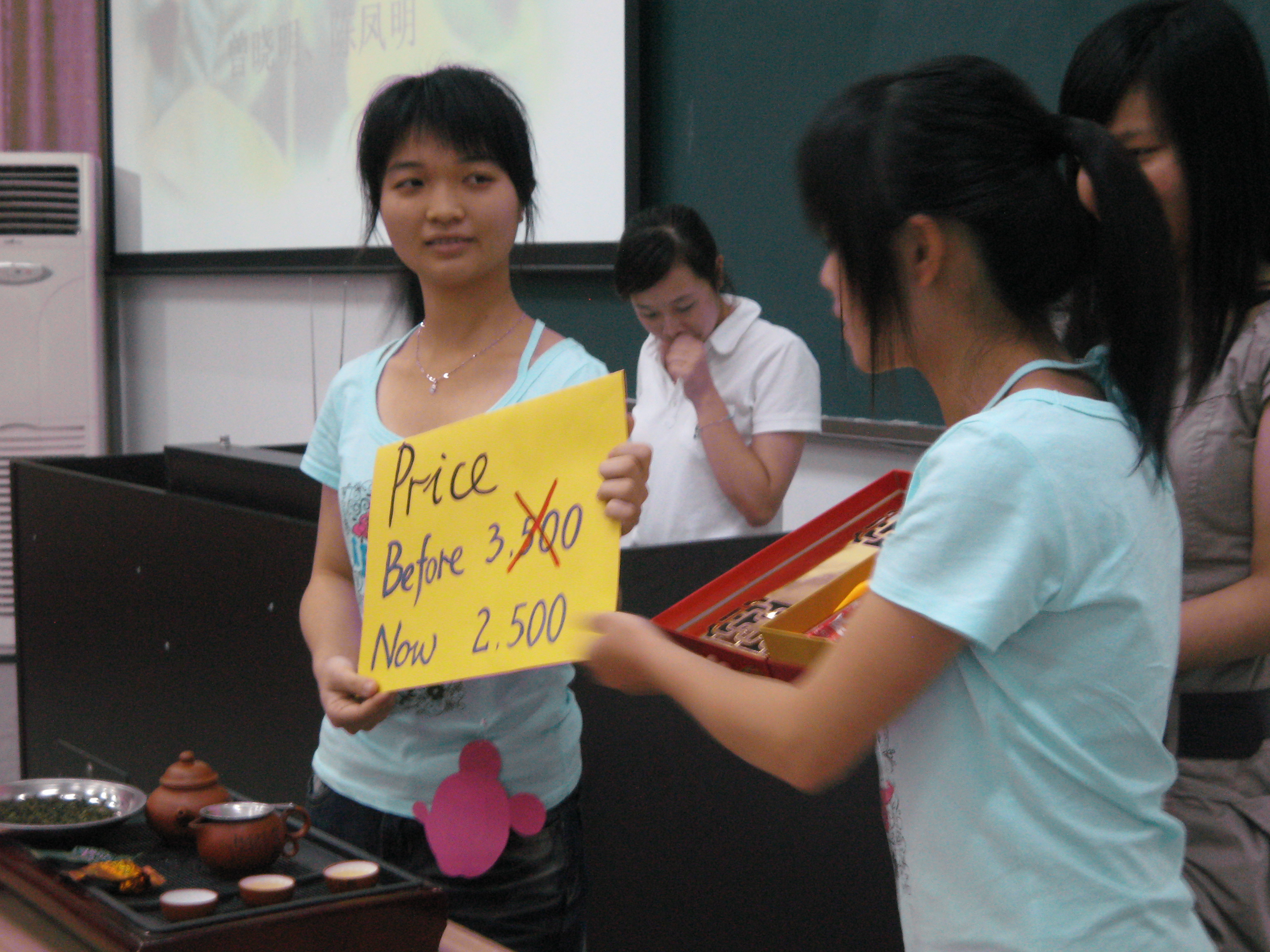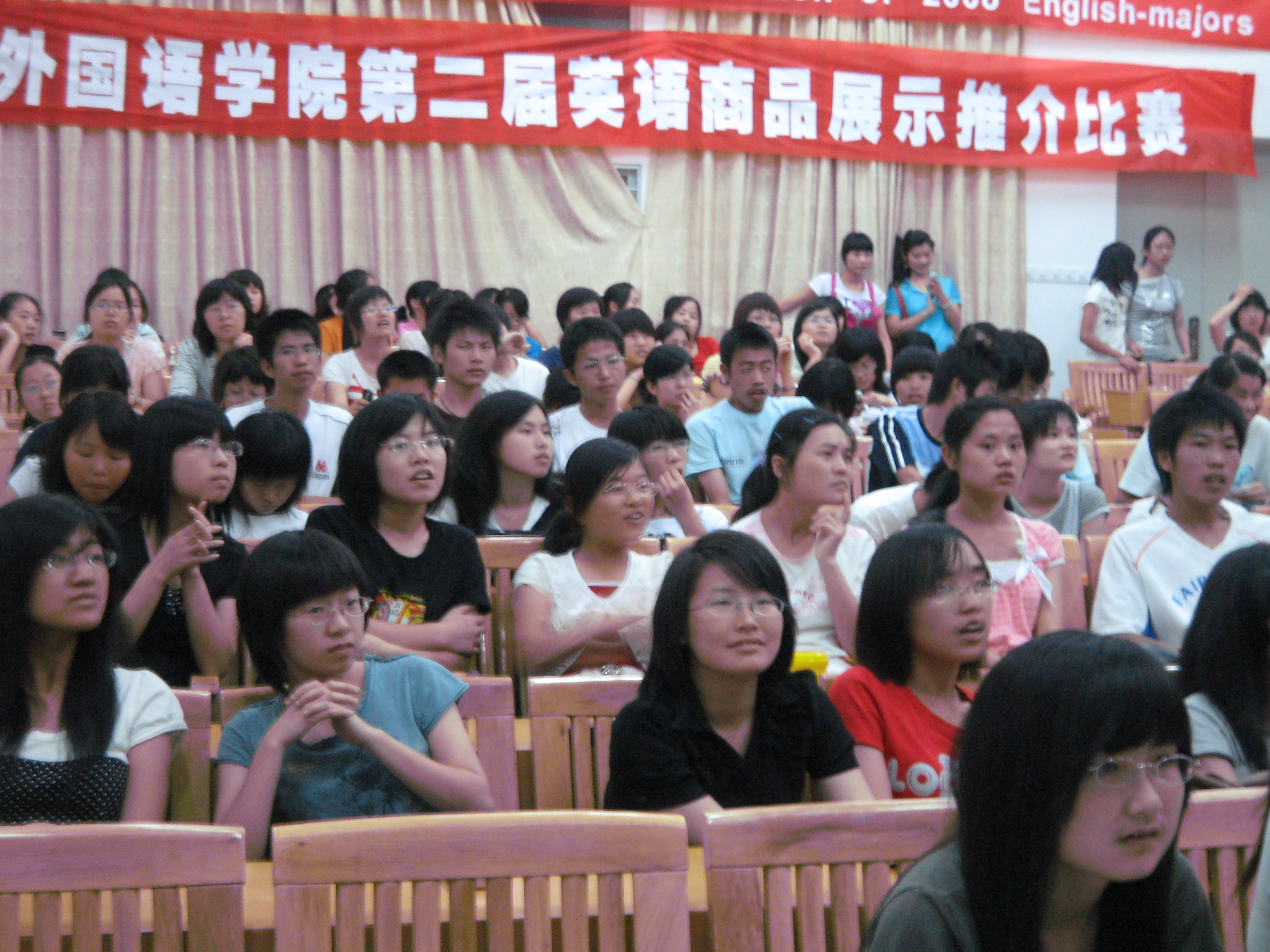 选手们充分发挥各自的创新能力,用娴熟的英语,采用别具一格的表达方式向观众推介商品,如羽毛球拍、MP4、运动鞋等。在推介商品时,他们积极与观众互动,现场气氛活跃。其中来自07级英语教育(2)班的两位选手以生动诙谐的语言介绍了扇子的环保、装饰等功能。她们独特而又新颖的表现,多次博得观众的热烈掌声,最终摘得桂冠。