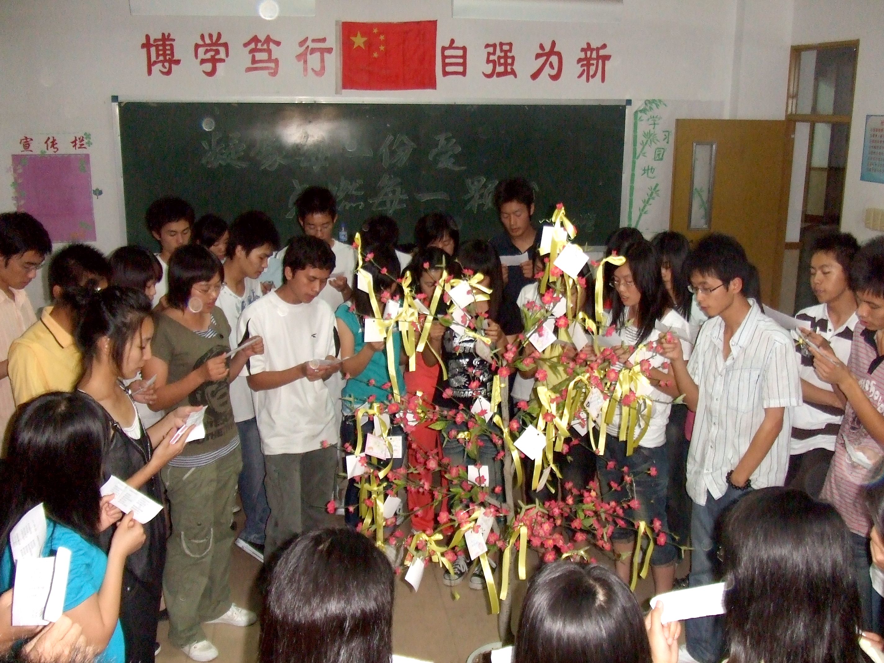 另外,07公管班还捐赠了一株“希望之树”——一株象征着中国人气节的红梅。红梅的枝干上系着黄丝带和同学们的祈福、祝语。“有爱就会有希望,有爱就会有信心。献出你的一份爱,让世界充满希望。”(人文学院)