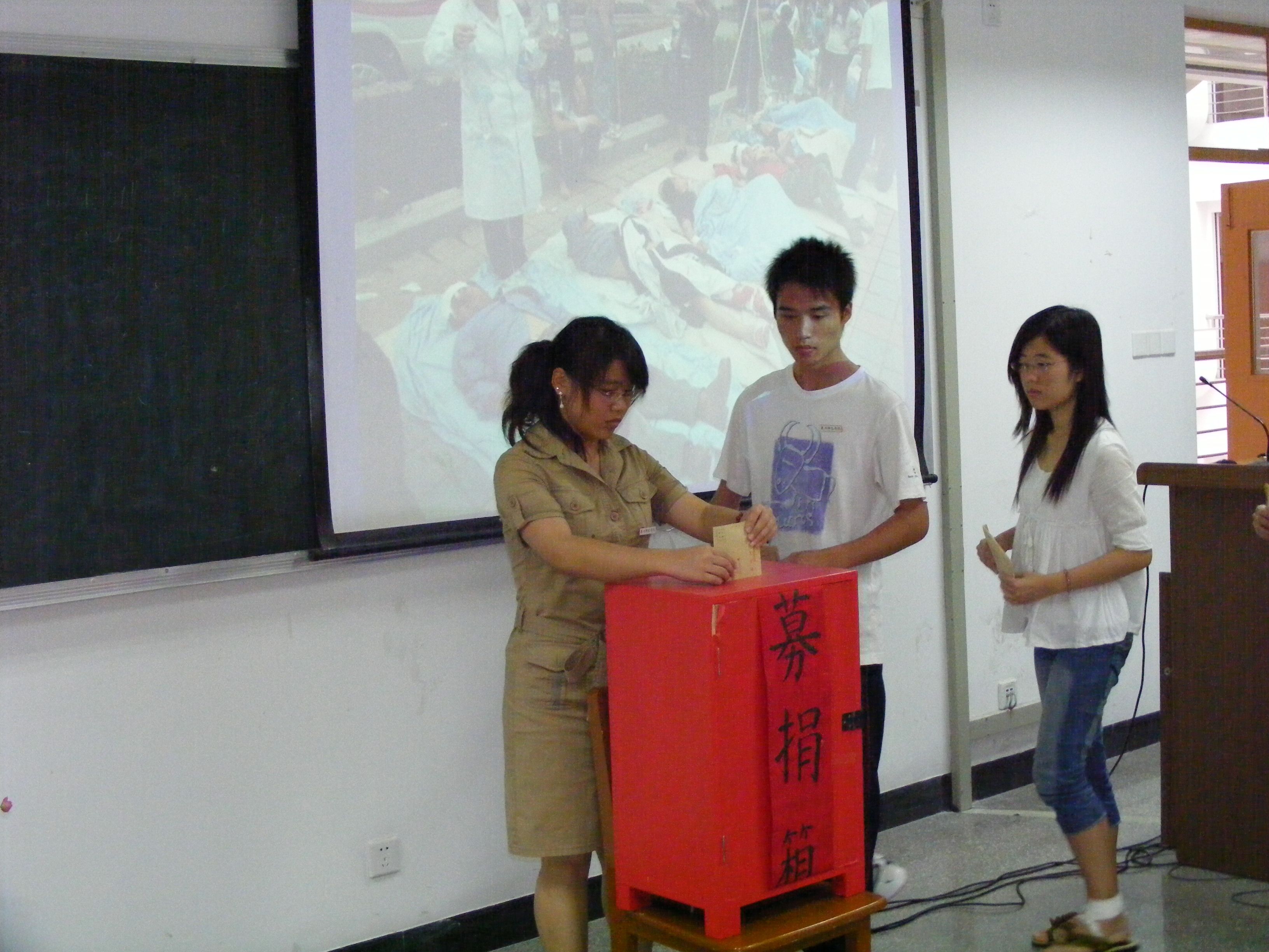 5月19日下午,人文学院在荣茂楼302 举行“万众一心,抗震救灾”募捐仪式。