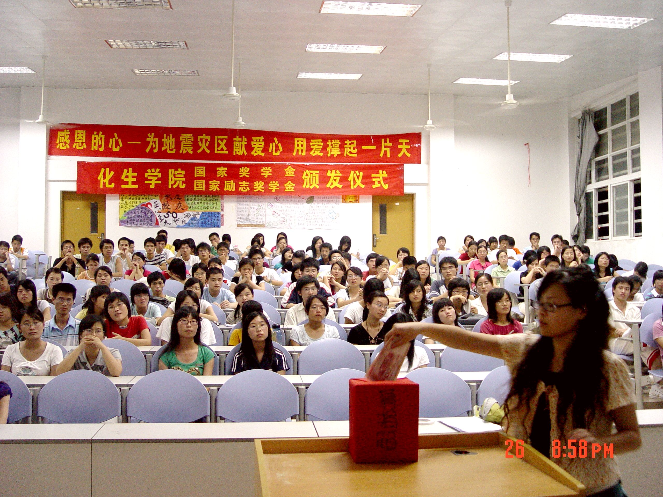 本次活动为三个部分:化生学院2007年国家奖学金(国家励志奖学金)颁发仪式、“感恩的心”主题教育及为四川灾区献爱心。颁奖仪式结束后,全体师生们观看了四川灾情的介绍,来自06级食品班的柯江波同学和07级化工班的王忠付同学分别深情朗诵了诗歌《你在山那边,我在山这边》和《14时28分31秒》以表达大家对灾区同胞的关心。活动中,化生学院35名国家(励志)奖学金获得者为灾区捐了16535元。