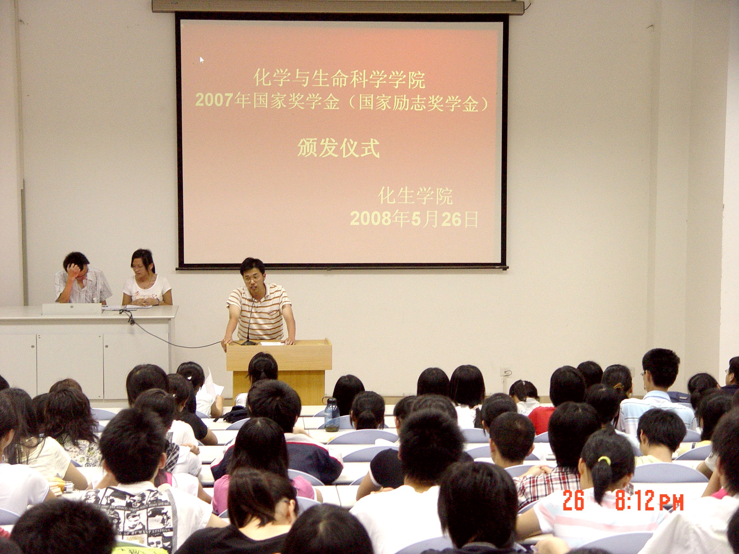 5月26日晚,化生学院在理工楼319室举行2007年国家奖学金(国家励志奖学金)颁发仪式暨感恩的心主题教育活动。参加活动的有该学院部分老师、国家奖学金(国家励志奖学金)获得者以及受过资助的学生。