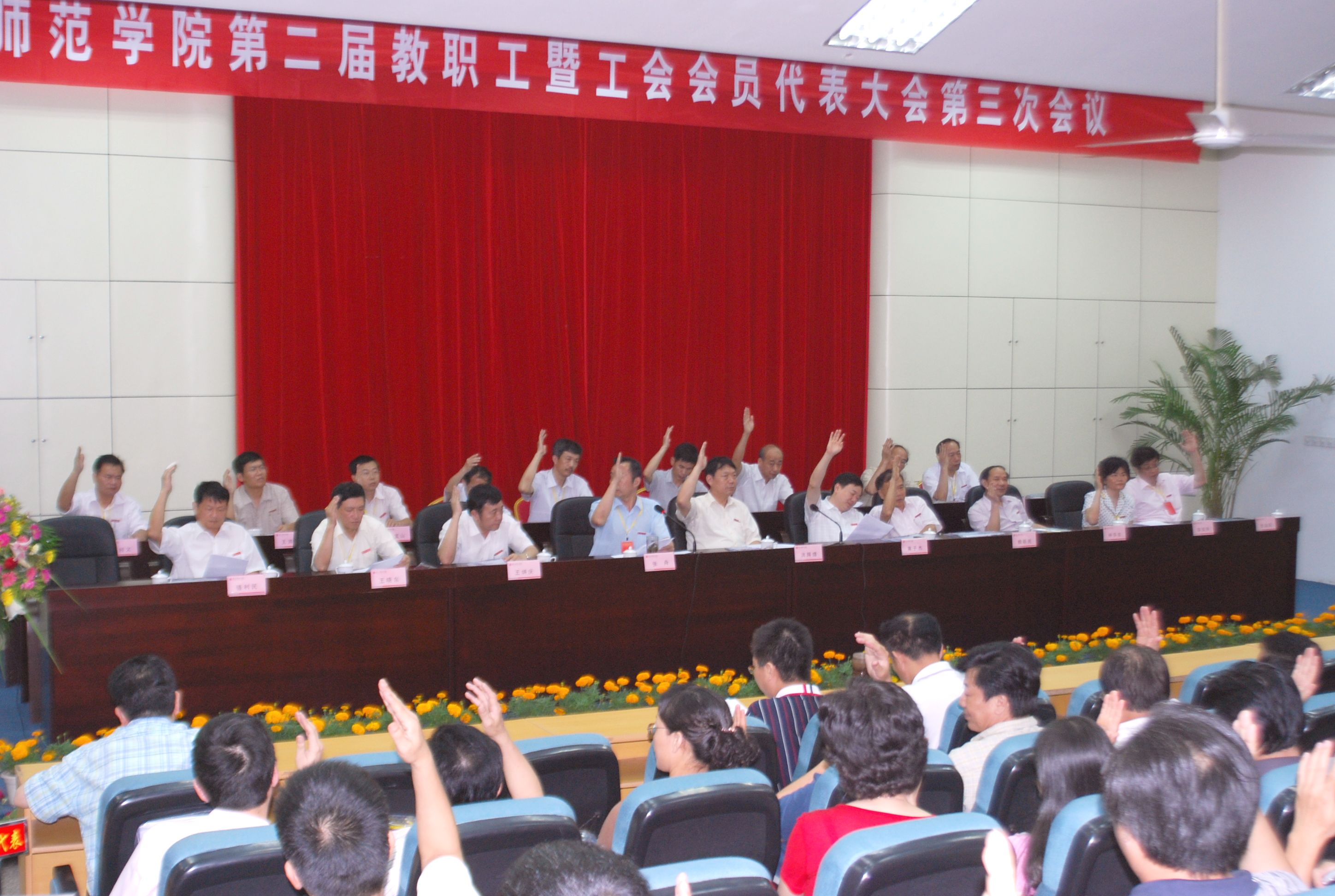 大会审议通过了《学校工作报告》、《泉州师范学院工会委员会工作报告》、《泉州师范学院2008年度经费预算草案》以及以书面形式提交大会审议的《泉州师范学院工会2007年度经费预算审查工作报告》、《泉州师范学院科研奖励办法(修订)》、《泉州师范学院科研工作量计算办法(修订)》、《泉州师范学院二级教代会工作规程》(讨论稿)。代表们对以上几份文件提出了许多建设性意见和建议。