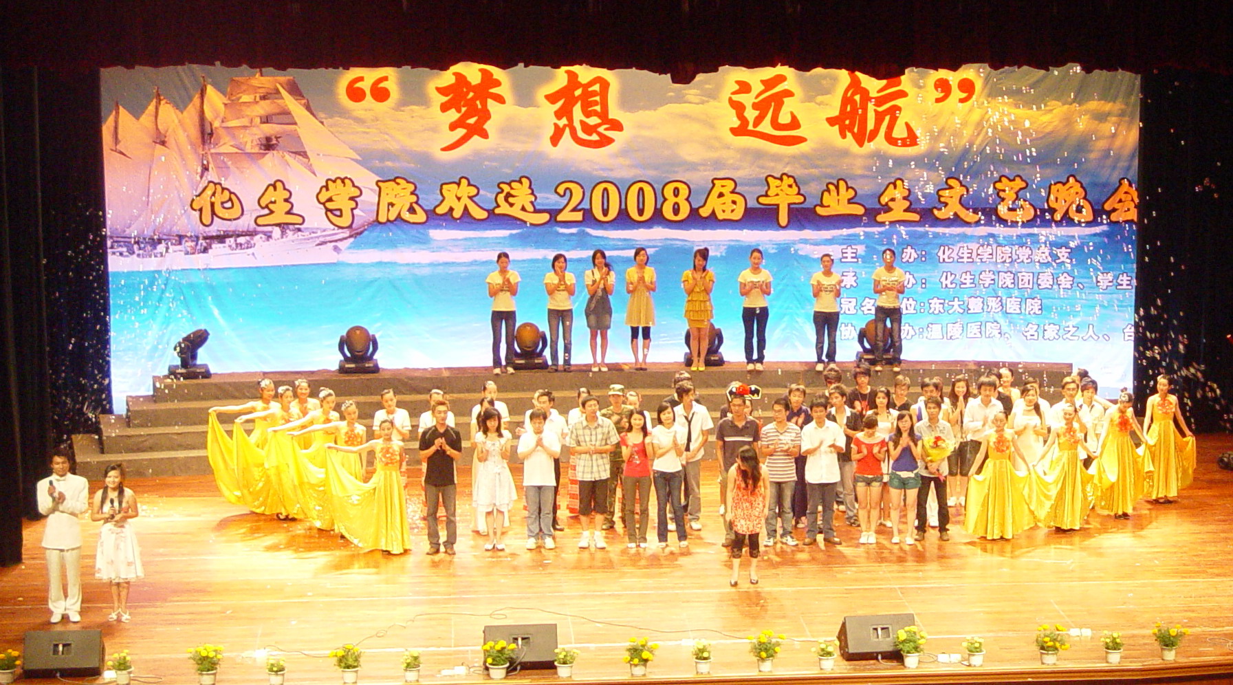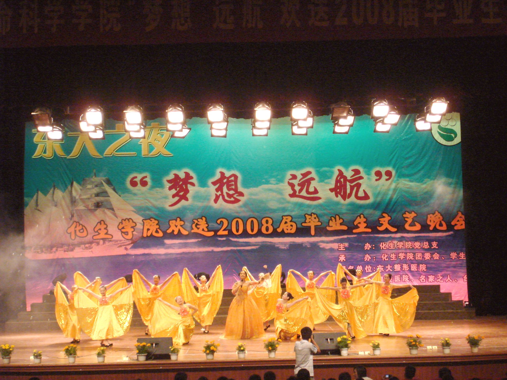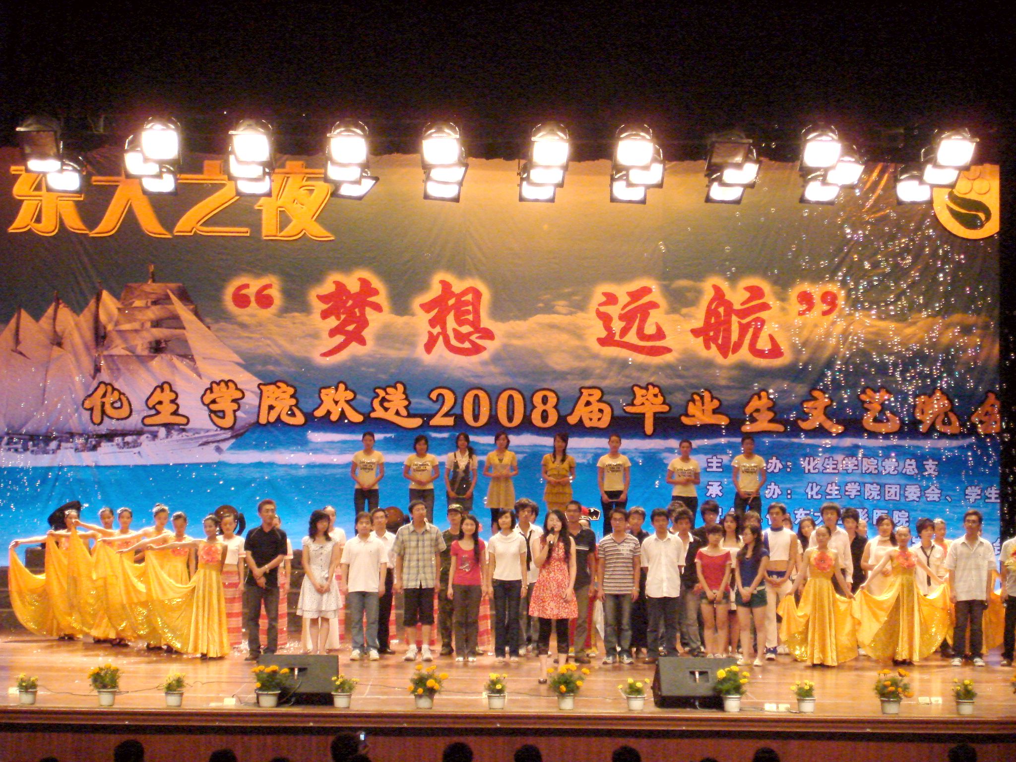 6月22日晚,化生学院“东大之夜梦想远航——欢送2008届毕业生晚会”在陈祖昌大礼堂举行。校党委副书记张舟、机关相关部门负责人、化生学院党政负责人、嘉宾代表及2004级毕业生和2005、2006、2007级的同学们参加了晚会。