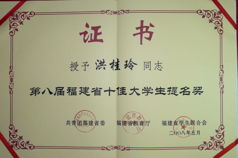 日前,我省第八届“十佳大学生”已揭晓。我校理工学院洪桂玲同学获第八届福建省“十佳大学生”提名奖。