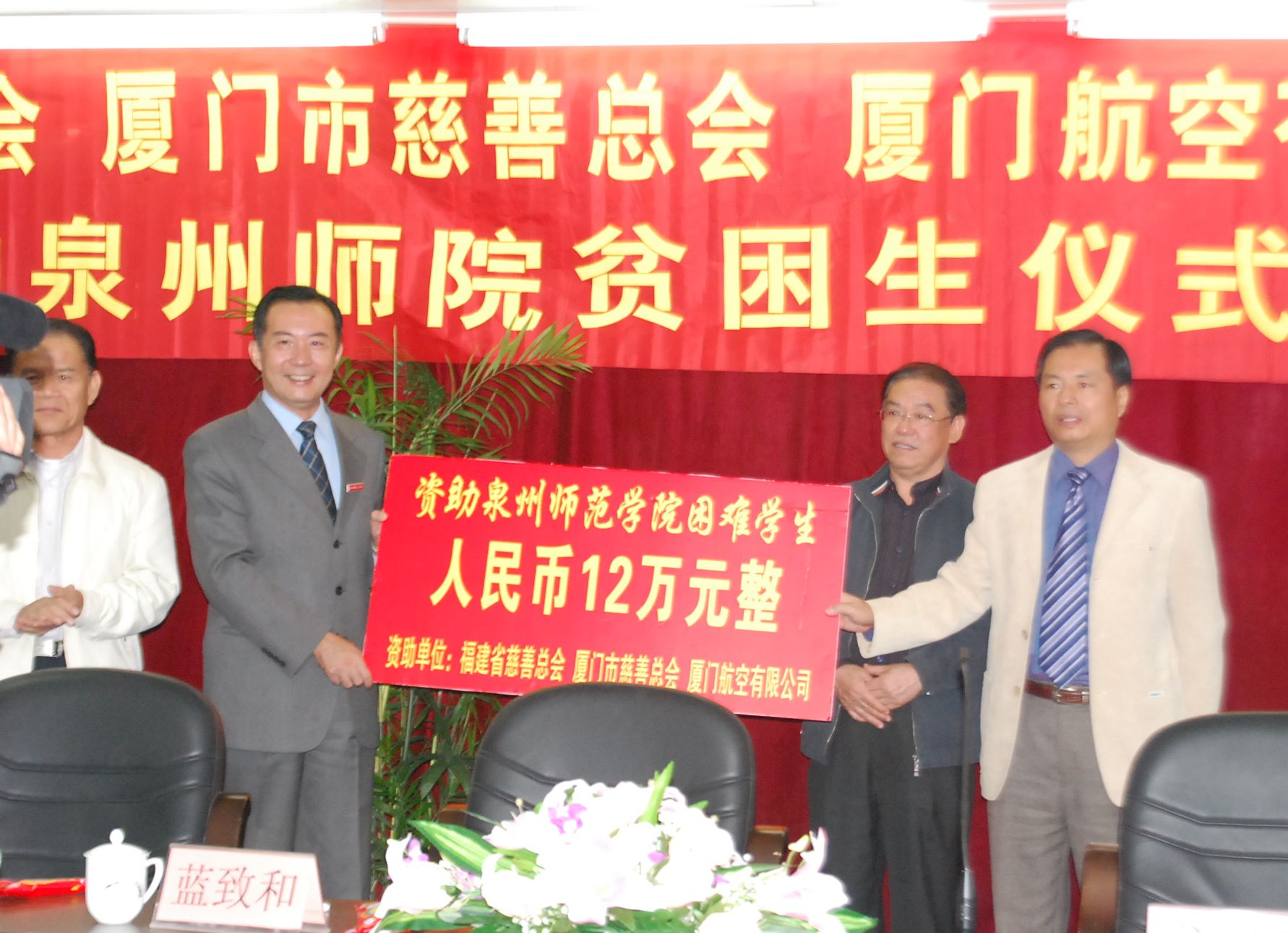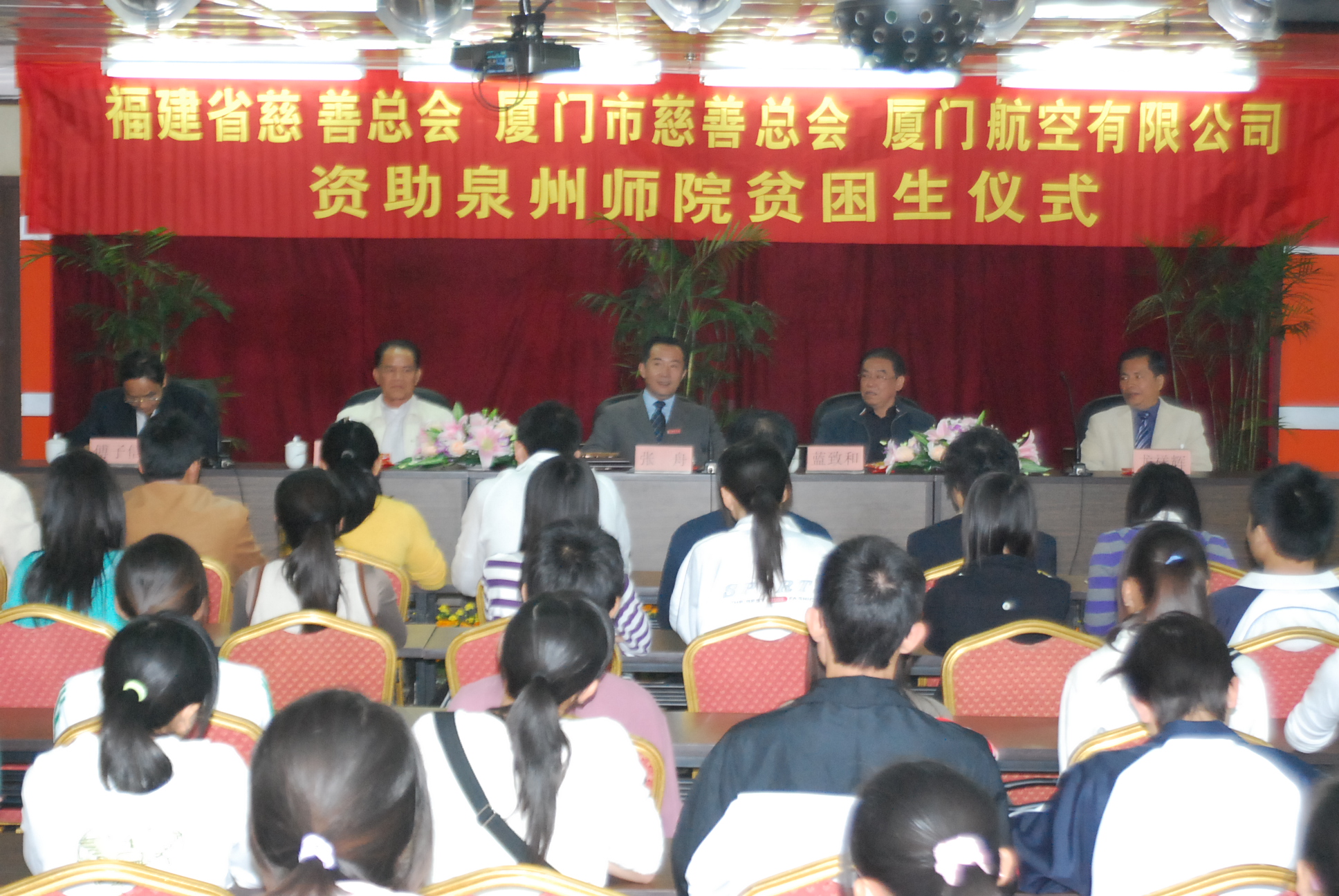 会上,张舟、蓝致和、杨昌明、尤祥辉、傅子信为受资助学生发放助学金。今年,由福建省慈善总会、厦门市慈善总会牵线,厦门航空有限公司捐助我校120名贫困生每人1000元,共计12万元整。