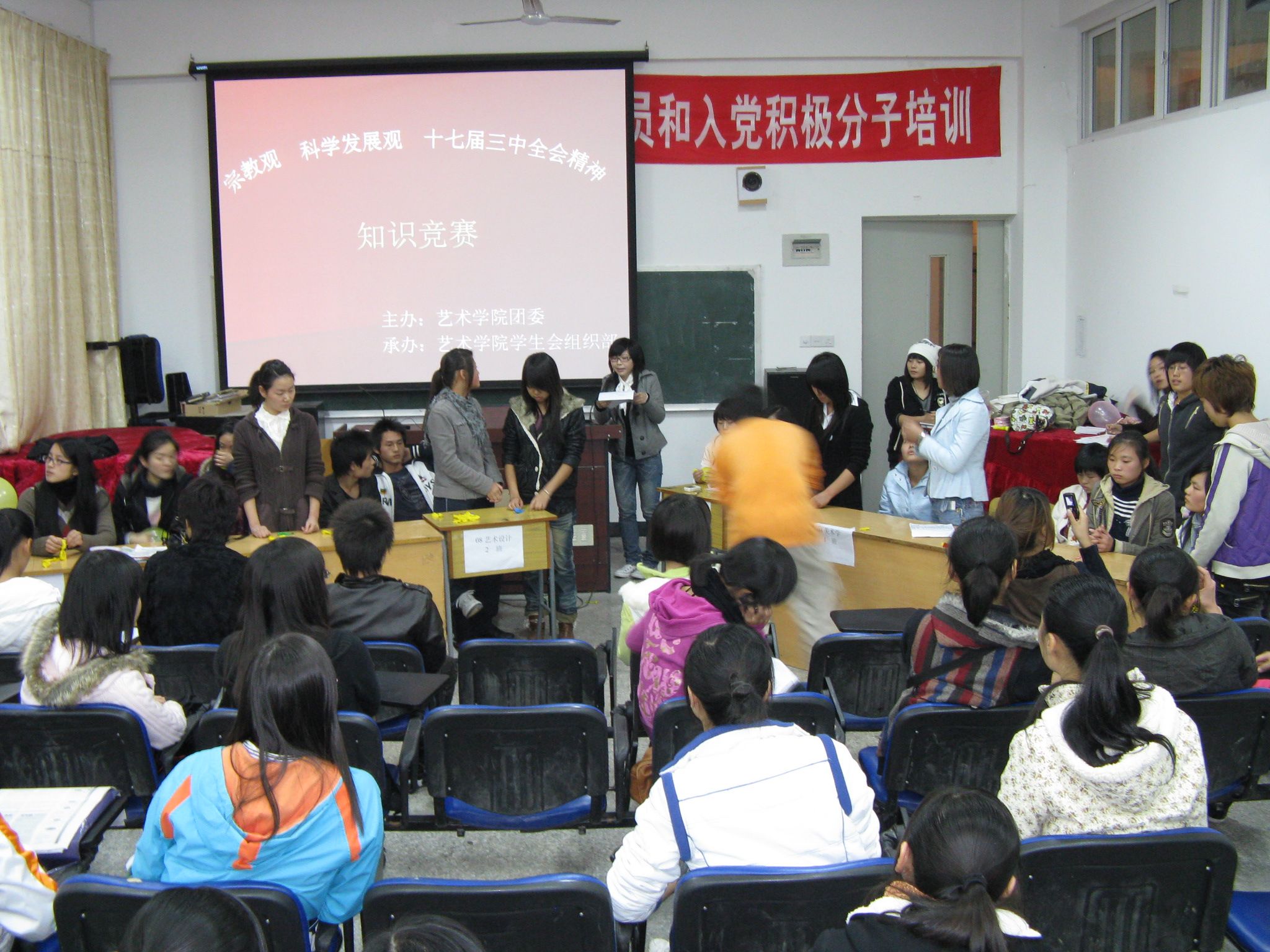 2008年11月7日晚上,艺术学院学习“科学发展观、马克思主义宗教观及十七届三中全会精神”知识竞赛在俊秀文学院高职楼109多功能厅进行。比赛以班级为单位,经过了笔试初赛后,总共有6支队伍进入了本轮复赛。复赛采取必答题、吹气球抢答等多种形式,寓教于乐。最终,08美术学(2)班以优异的成绩摘得了竞赛的冠军。(艺术学院)