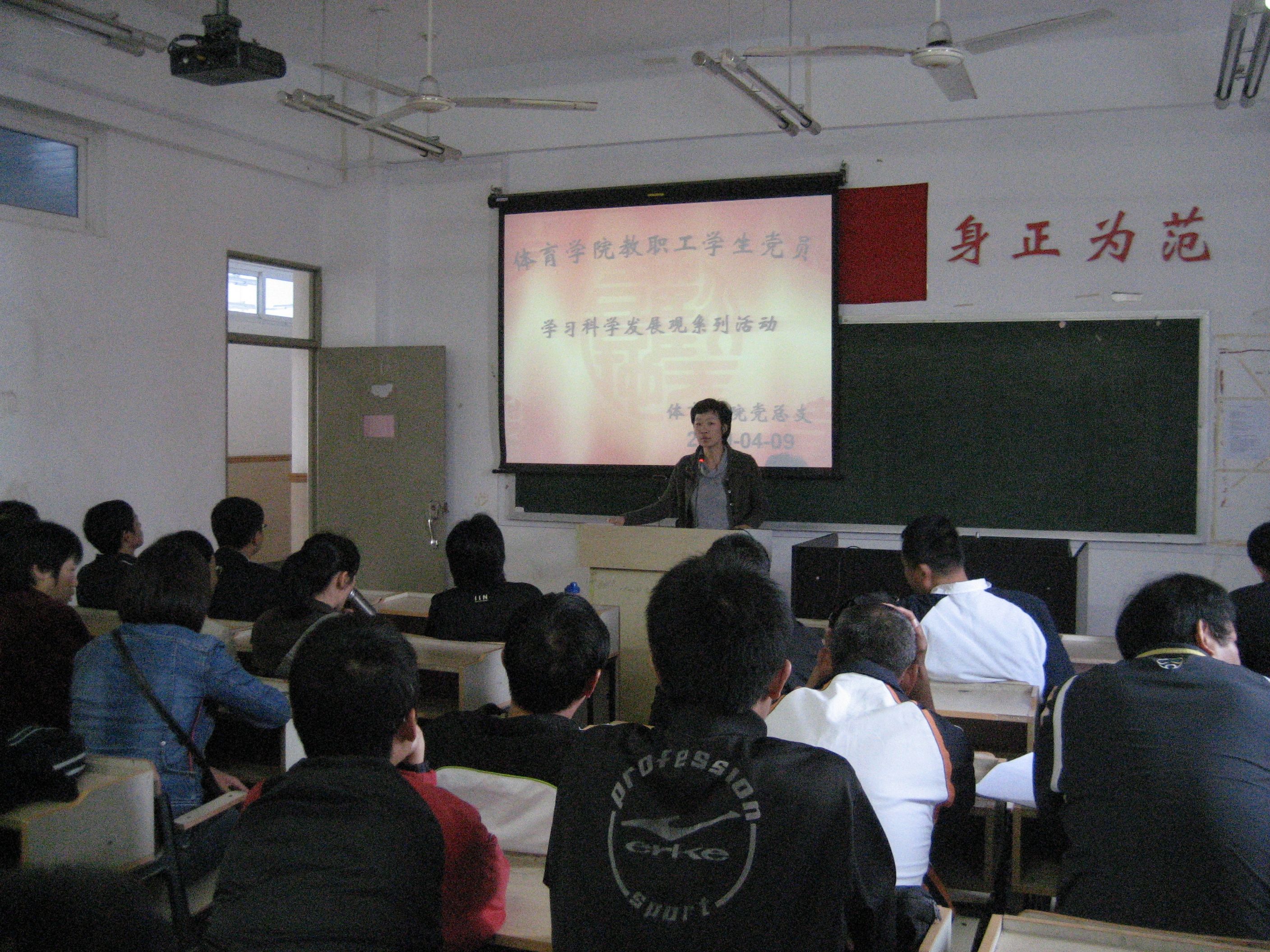 2009年4月9日下午,体育学院组织全院教职工、学生党员在文科楼A栋50教室集体观看科学发展观学习辅导视频资料。