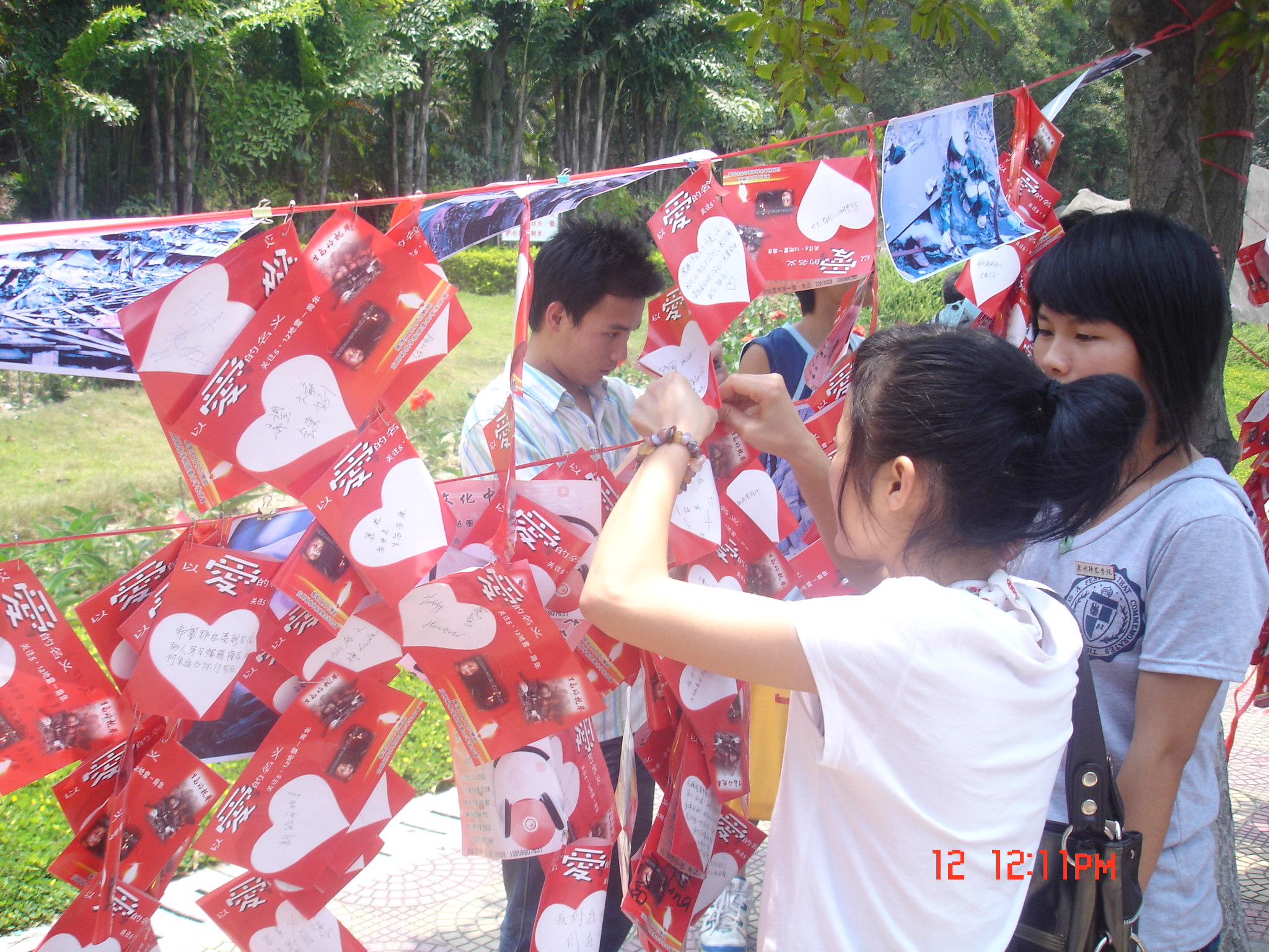 5月12日, 时值汶川地震一周年之际和“5·12”全国首个防灾减灾日,为缅怀在汶川大地震中逝去的生命,号召同学们铭记历史,增强自身安全意识,提高自我保护能力,应用科技学院在东海校区校园主干道上举行主题为“让爱继续,让我们在一起”的纪念汶川大地震一周年卡片送爱心活动。