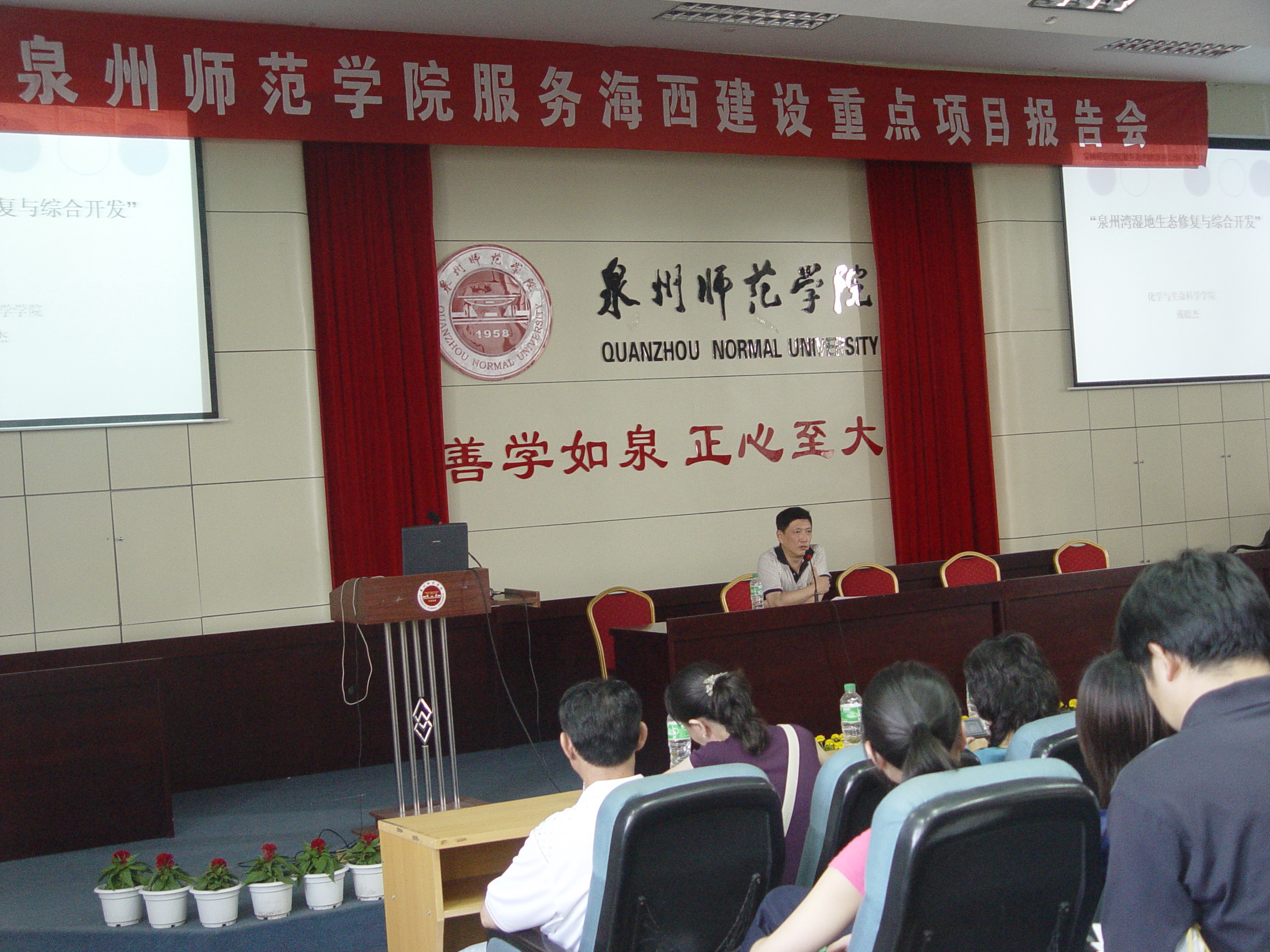 2009年6月9日下午,我校服务海西建设重点项目第一场报告会在孙中山第二学术报告厅隆重举行.此场报告会的主题是化生学院主持的两个重点项目“泉州湾湿地生态修复与综合开发”和“泉州地区工业废水的综合治理”。出席此次报告会的有副校长王晓东,科研处、化生学院老师,还有来自人文学院、理工学院、艺术学院、资环学院等其它学院的师生代表共200余人。