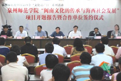 2009年6月11日上午,作为泉州市庆祝中国第四个“文化遗产日”系列活动的重要组成部分,“闽南文化的传承与海西社会发展”项目开题报告暨合作单位签约仪式在我校东海校区行政楼二楼大会议室召开。该项目是福建省高校服务海西建设重点项目之一,项目主持单位是我校,合作单位有泉州市文化局、中国闽台缘博物馆、泉州市教育局、泉州市体育局、泉州电视台、泉州市海外交通史博物馆、泉州市华侨历史博物馆、泉州市图书馆、泉州画院、泉州少林寺、晋江博物馆、赛琪体育用品有限公司等。与会人员包括各个项目合作单位的负责人,校领导,宣传部、科研处、人文学院的部分领导及七个子项目的项目组成员。