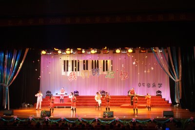 6月7号晚上,09届音乐学毕业生在陈祖昌礼堂齐声放歌。节目精彩纷呈、浓情感人肺腑,整场晚会以活跃的气氛持续了两个多小时,节目以歌舞、声乐小品、器乐演奏为主。有极富专业表现力的歌曲演唱,有含蓄柔美的古典舞,有让人耳目一新的歌剧表演,有余音绕梁的民乐演奏,有风趣幽默的双人哑剧,有阵容强大的集体节拍舞……晚会节目层层递进,最后以一曲由05音乐学自己创作的歌曲《我们的记忆》把晚会推向高潮,流露出大家的依依惜别之情。