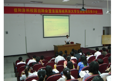 本次招聘会分为三个部分:创业指导老师浅谈创业商机、信和涂料品牌总监进行项目推介、招聘岗位介绍及投交简历。工商信息学院创业指导老师彭振龙从就业市场现状入手,分析大学生创业所面临的机遇以及如何才能顺“势”而为实现创业梦想,从创业的商业机会即金融危机大调整下的天时、海峡西岸的地利和国家出台优惠政策的人和,浅谈大学生创业所需具备的条件。信和涂料有限公司品牌总监就田园风光青年创业援助项目进行推荐介绍。推介会上,信和涂料相关负责人对招聘岗位进行介绍。招聘会结束后,现场同学提交简历。