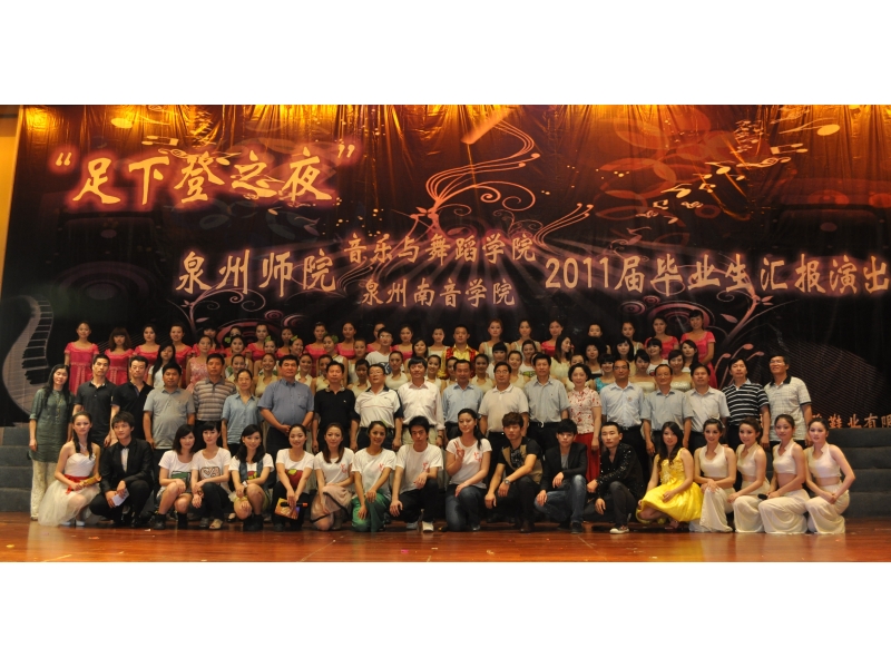 6月2日晚,音乐与舞蹈学院2011届毕业生汇报演出在陈祖昌大礼堂成功举行。校党委副书记张舟、副校长王炳庆、市文联主席、市委宣传部副部长熊志强、市文化广电新闻出版局局长张镇国、市委宣传部副长许旭明、市教育局副局长吴少锋、市文化广电新闻出版局副局长林育毅、市南音研究院院长吴珊珊、市曲艺家协会主席尤春成、市舞蹈家协会主席蔡湘江、市音乐家协会副主席叶端芳、林鸿平、泉州电视台文艺部总监周斌、各实践基地校长、学校各部门主要领导等和我院师生观看了演出。