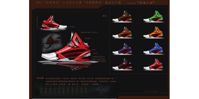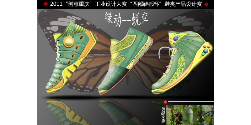 2011“创意重庆”工业设计大赛“西部鞋都杯”鞋类产品设计赛以“绿意·灵动·魅力”为主题,由重庆市经济和信息化委员会、重庆市创意产业发展领导小组办公室、璧山县人民政府联合举办,于2011年6-9月在中国西部鞋都——重庆•璧山举行。该活动旨在倡导原创设计,挖掘和培养制鞋专业设计人才,不断提升制鞋行业的核心竞争力。大赛共设创意大奖1名,金奖2名,银奖3名,铜奖6名。经过4个多月的激烈角逐,共收到全国各地参赛实物作品及效果图作品192件,最后23件参赛作品脱颖而出,摘得奖项。