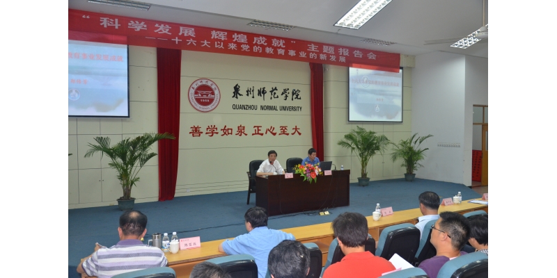 郑传芳书记围绕“十六大以来党的教育事业的新发展”这一主题,从党和国家高度重视发展教育、十六大以来党关于教育工作的新思路、我省教育事业发展成就及办学任务三个方面进行阐述。他对我国教育历史的脉络进行了梳理,并介绍了三代领导人对教育的一些理论和举措,用大量的数据阐述了建国60年以来,特别是党的十六大以来教育发展的巨大成就以及我省当前教育的主要任务。郑传芳书记还勉励泉州师范学院要以这次申硕成功为契机,力争更好的发展。