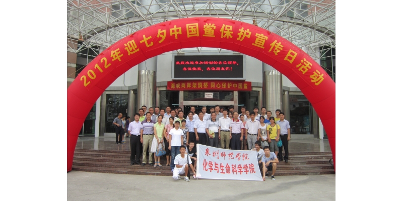 8月19日, 由我校与市海洋与渔业局、市科协以及台湾湿地学会联合主办,市科技馆、丰泽区海洋与渔业局、泉州湾河口湿地自然保护区管理处、泉州红树林保护与研究发展协会、市野生动植物保护协会、市审计局青年志愿者服务队、市生物学会等单位和团体协办的2012年迎七夕中国鲎保护宣传日活动在市科技馆和惠安青山湾隆重举行。此次活动面向全市市民,属首次海峡两岸共同举办的濒危水生生物中国鲎保护与宣传活动。