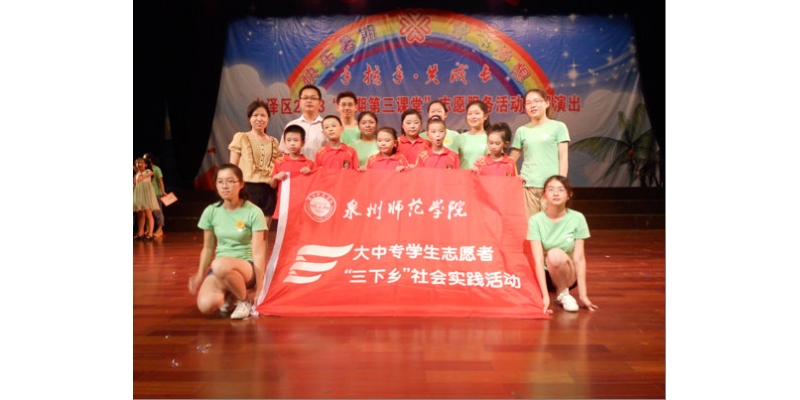 8月16日晚上,由泉州市丰泽区委文明办、丰泽区非公企业党工委、丰泽区教育局等携手主办的“手拉手·共成长”——丰泽区关爱未成年人“暑期第三课堂”志愿服务活动汇报演出在泉州市青少年宫举行。我校实践队11名同学荣获“优秀志愿者”称号,所负责的鸿利来皮塑活动营、实达工艺活动营、宝山社区活动营、灯星社区活动营均被评为“优秀活动营”。