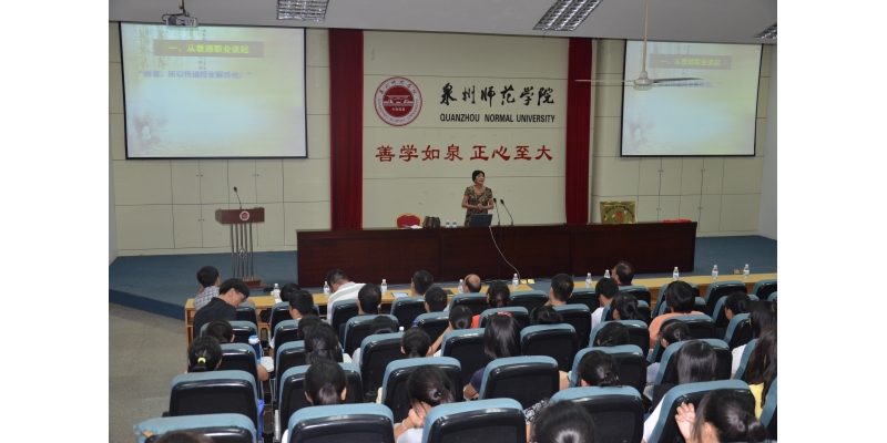 “中国老百姓、炎黄好儿孙”。伴随着《公民道德歌》深情悦耳的旋律,泉州师范学院“道德讲堂”正式拉开帷幕。在第一个环节唱一首歌之后,主持人杨向蓉老师深情地讲述了毛泽东同志尊师重道的故事。随后,在两位同学的带领下,现场的师生齐声诵读了唐代著名文学家韩愈《师说》中的经典章节,于浴贤教授作了精彩点评。在听一个讲座环节,于浴贤教授带来了《爱心,铸就师德之魂》的主题讲座。讲座内容丰富,谈古论今,旁征博引,既有对传统尊师重道的解读,也有对现实典型案例的剖析,从多维度阐述了爱心在师德中的重要性,于教授声情并茂的精彩演讲赢得了在场师生的阵阵掌声。讲座结束后,现场的师生纷纷发言,畅谈自己的道德感悟。在送一个吉祥环节,学生代表为于浴贤教授赠送了鲜花,预祝于教授重阳节快乐。现场的同学也纷纷在明信片上写上自己的祝福,感谢老师的培育之恩,祝愿老师长辈吉祥快乐。(宣传部)