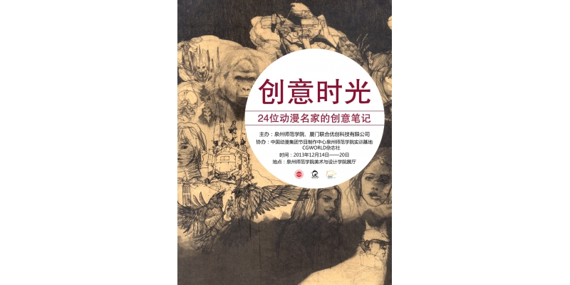 12月14日至20日,由泉州市文学艺术界联合会、泉州师范学院、厦门联合优创科技有限公司共同主办与策划,美术与设计学院和中国动漫集团节目制作中心实训基地、CGWORLD杂志社协办的“创意时光——24位动漫名家的创意笔记”在美术与设计学院展厅展出。本次展览力图站在“东亚文化之都”的国际文化视野上,汇聚动漫界名家优秀作品来泉州展出,为泉州的东亚文化之都喝彩。