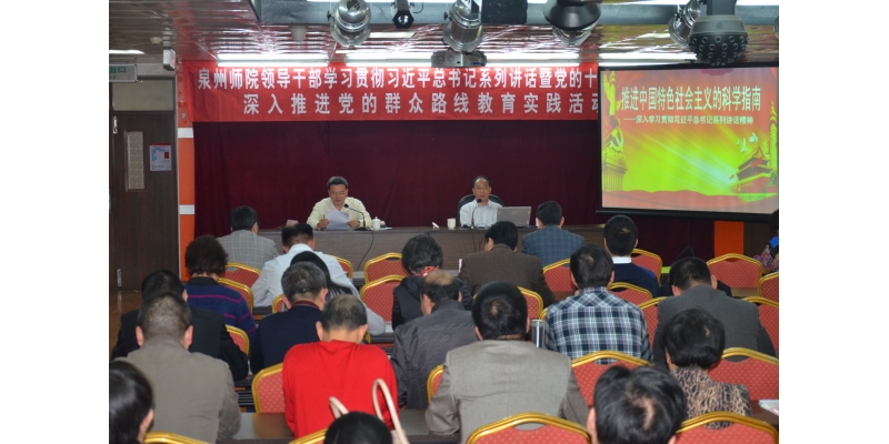 3月25日下午,学校领导干部学习贯彻习近平总书记系列讲话暨党的十八届三中全会精神深入推进党的群众路线教育实践活动培训班在行政楼第三会议室举行第四场专题辅导报告会,邀请全国党的建设研究会特邀研究员、福建省委党校党建教研部主任李新生教授作题为《推进中国特色社会主义事业的科学指南——学习习近平总书记系列讲话精神》的专题辅导报告。校领导游小波、张舟、高云程、王炳庆、王珊,院长助理、组织部部长陈亚兵,全校副科级以上干部参加报告会。报告会由党委副书记高云程主持。