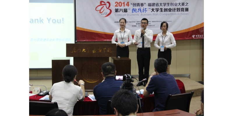 由共青团福建省委、省教育厅、省人力资源和社会保障厅、省科学技术协会、省学生联合会共同主办,厦门大学嘉庚学院承办的本届大学生创业计划大赛,共收到了全省43所高校的420件作品,经过书面评审、公开答辩,最终包括我校在内的10所高校的36件作品进入终审决赛,角逐金奖。终审决赛答辩分两个小组进行,最终评出“挑战杯”福建省大学生创业计划竞赛金奖作品25件。我校陈守仁工商信息学院3名参赛选手在刘飞老师的精心指导下表现优秀,最终以小组第八的成绩获得了金奖,并作为福建省18件作品之一推荐上报参加“挑战杯”全国赛。